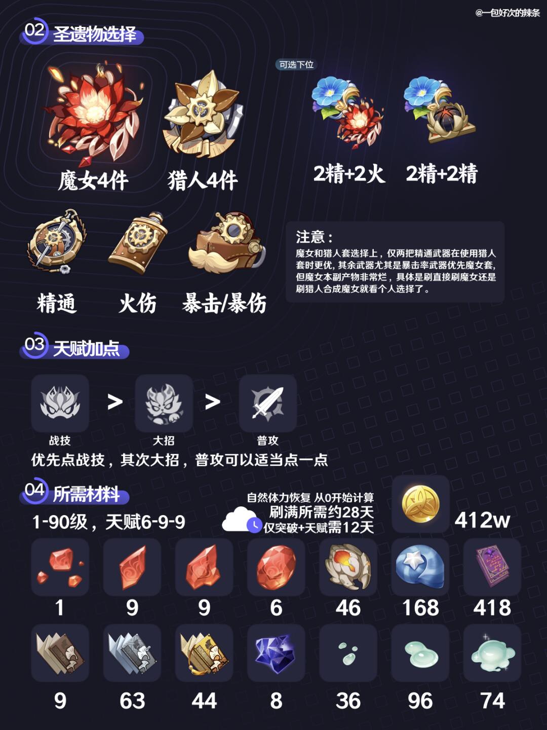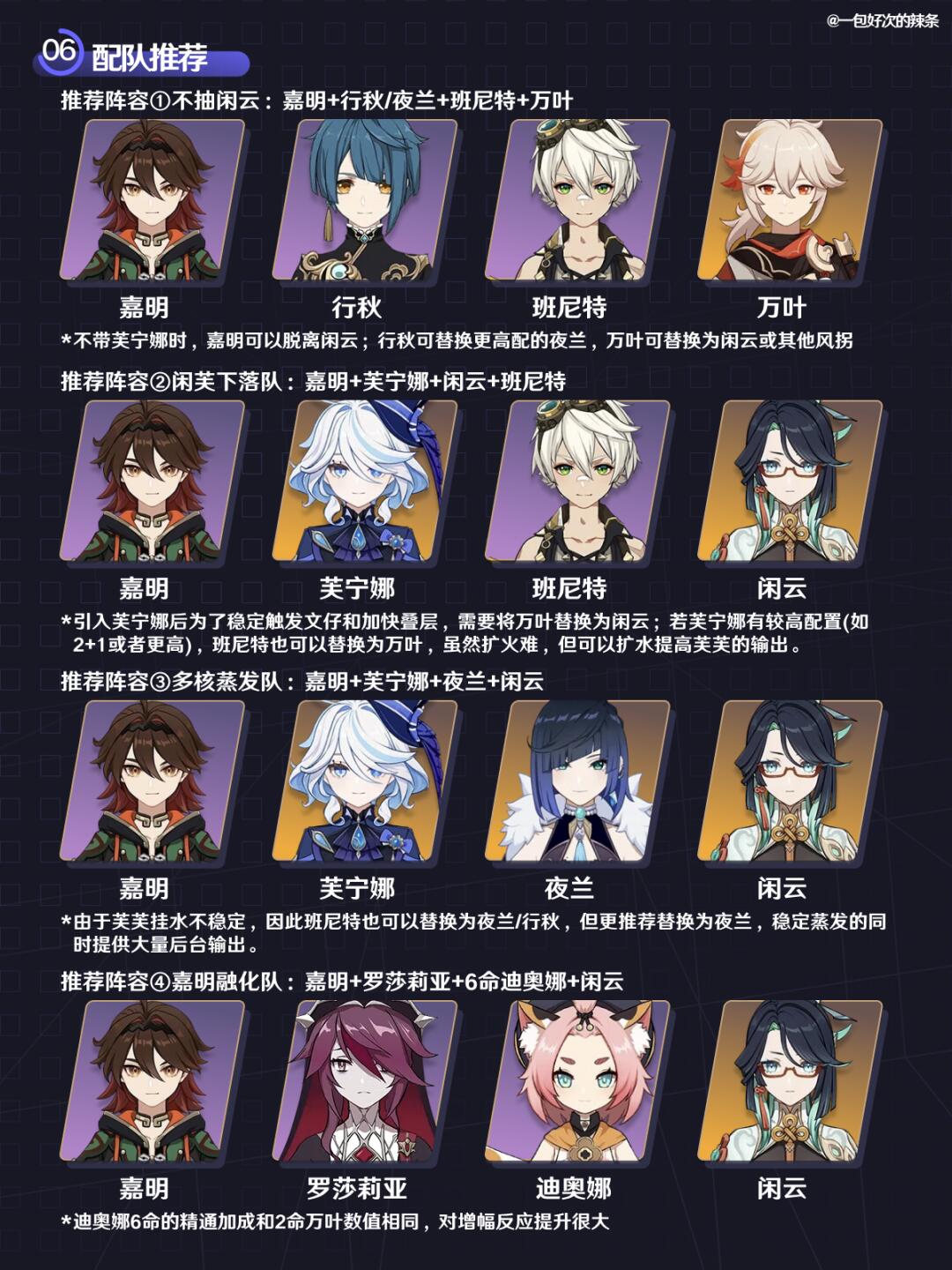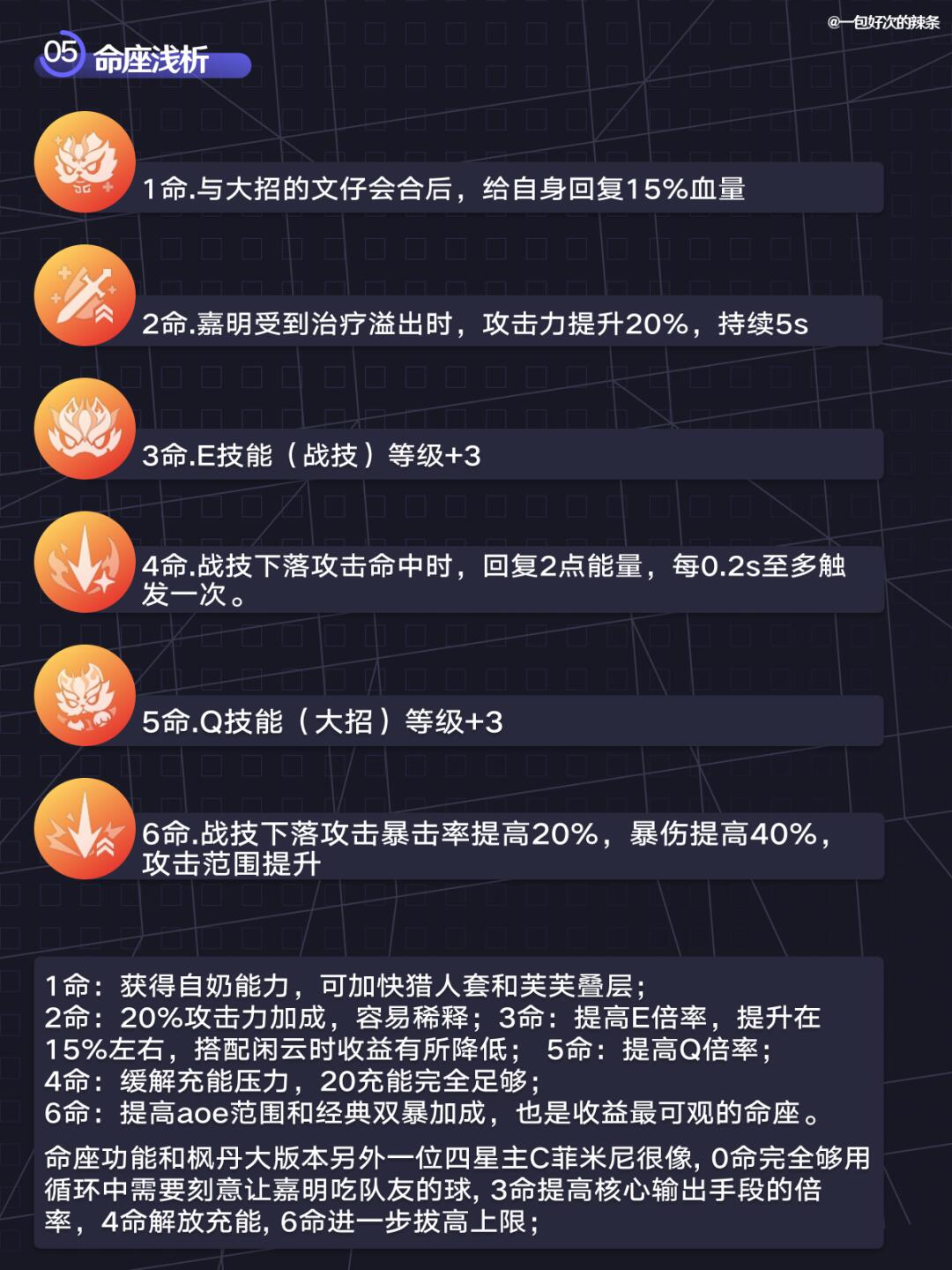 嘉明是比菲米尼还要更夸张一点的四星主c,但是毕竟是四星主c,上限全在闲芙的命座上,不要吹过头,忘了本体就是个四星角色; 嘉明的配队主要是以增幅反应即蒸发或融化为主,不打蒸发融化对比其他下落角色就几乎没有优势; 与菲米尼最大的不同是菲米尼是想提上限难,但下限有保底7w+dps的绽放队,而嘉明的上限可以通过闲云芙芙的命座拔高,搭配21闲芙一个蒸发下落40-50w轻轻松松。 嘉明虽然不需要手法登龙,但自带的战技下落攻击还是需要追着怪打,不能像魈一样灵活调整下落位置,下落手感比魈要笨重一些。