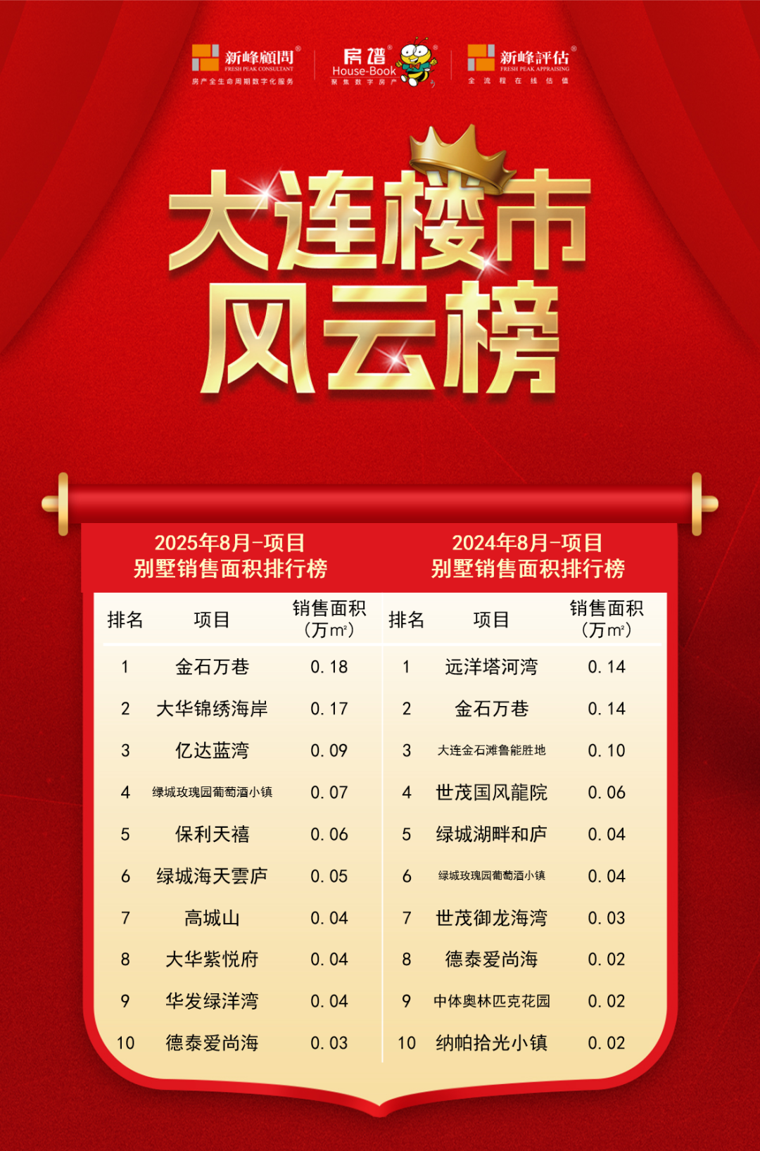 别墅销售排行榜上,金石万巷脱颖而出,华锦绣海岸、亿达蓝湾分列二三位,销售面积分别为0.18万㎡、0.17万㎡、0.09万㎡。