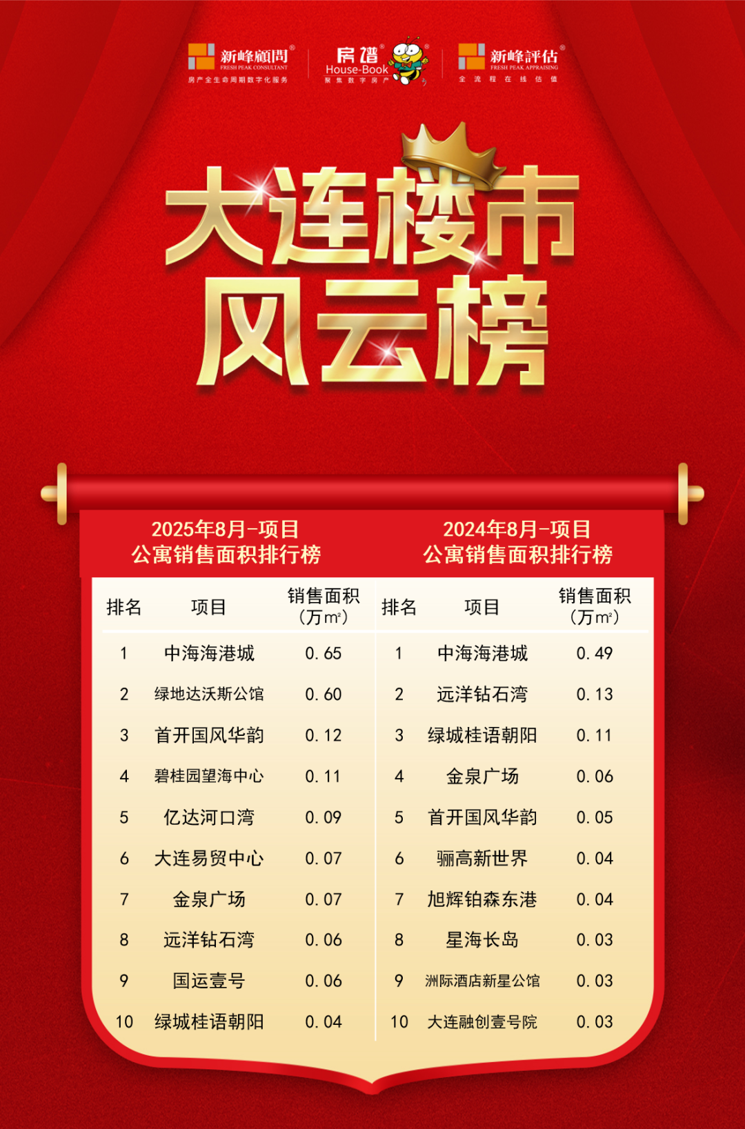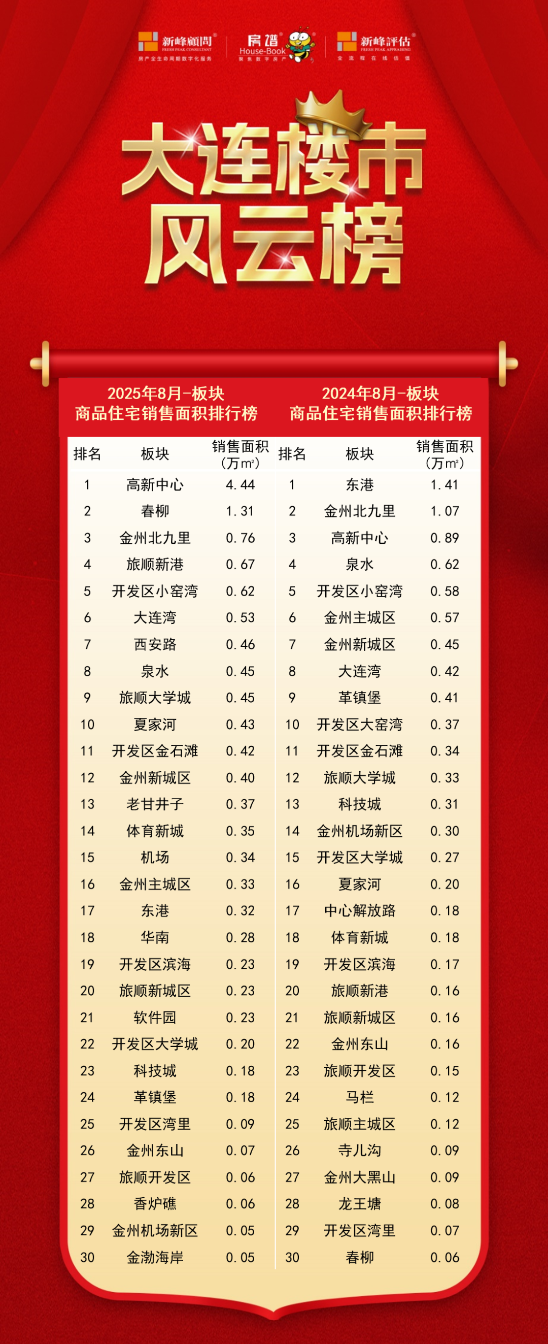 2025年8月大连楼市销量排行榜新鲜出炉,房谱科技&新峰顾问的统计数据为我们详细呈现了本月大连楼市在区域、板块以及不同物业类型方面的销售情况。