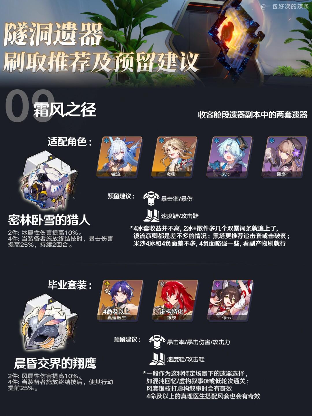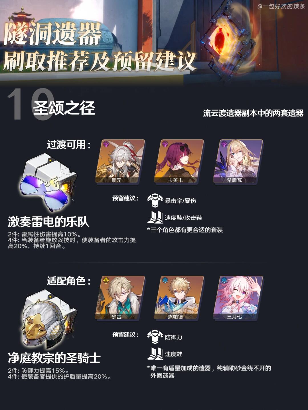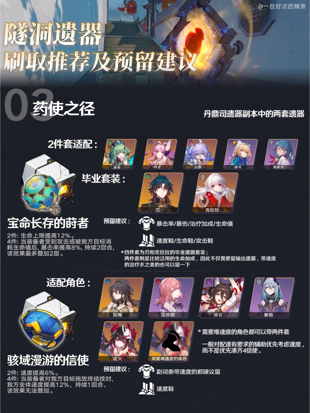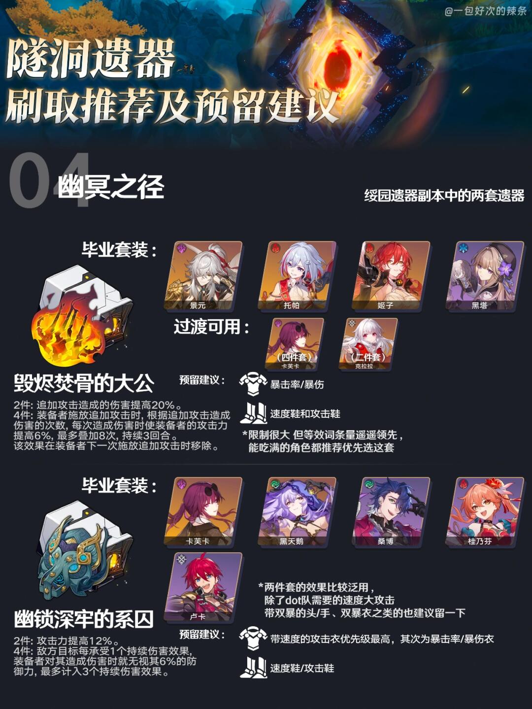 大家好,这里是一包好次的辣条! 这次的三倍掉落是明天(4.26)开始哦~ 惯例会以“毕业套装”和“过渡可用”区分输出角色不同遗器优劣, 主要是基于期望伤害和有效词条量的对比 ————————————— 如有遗漏/错误欢迎指出,共同进步~ 最近新玩家/回坑玩家多,大家友善讨论哦~ —————————————