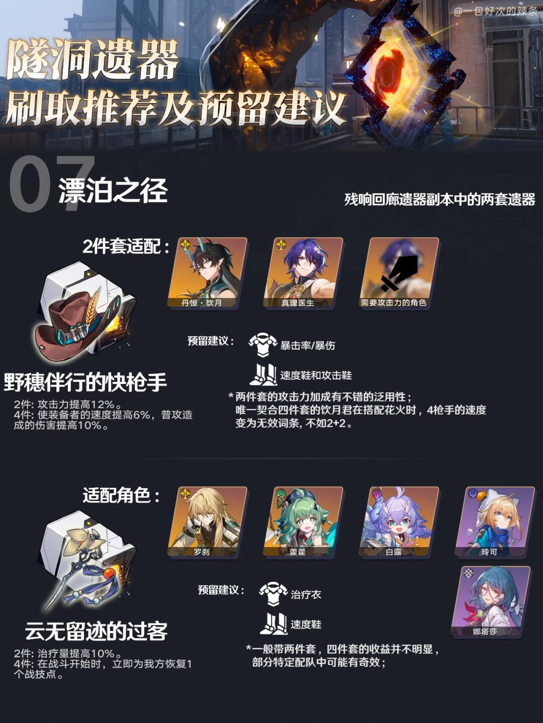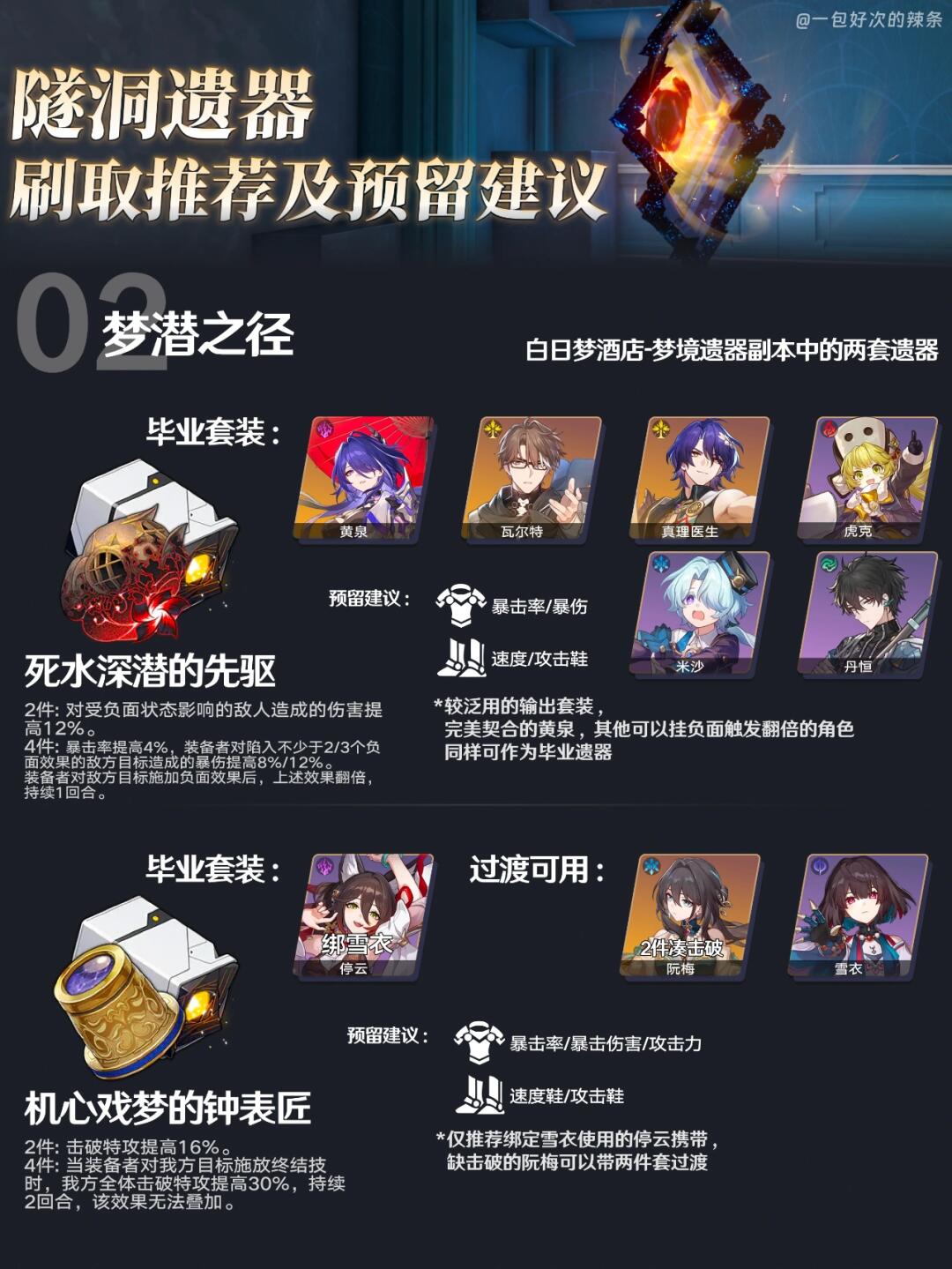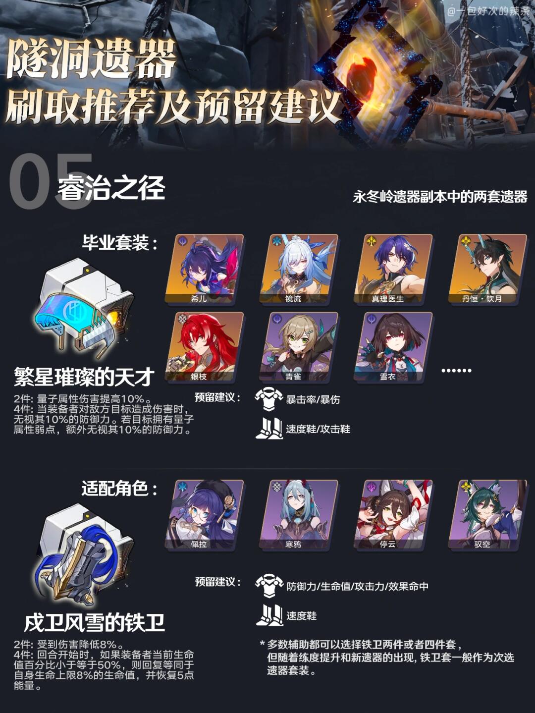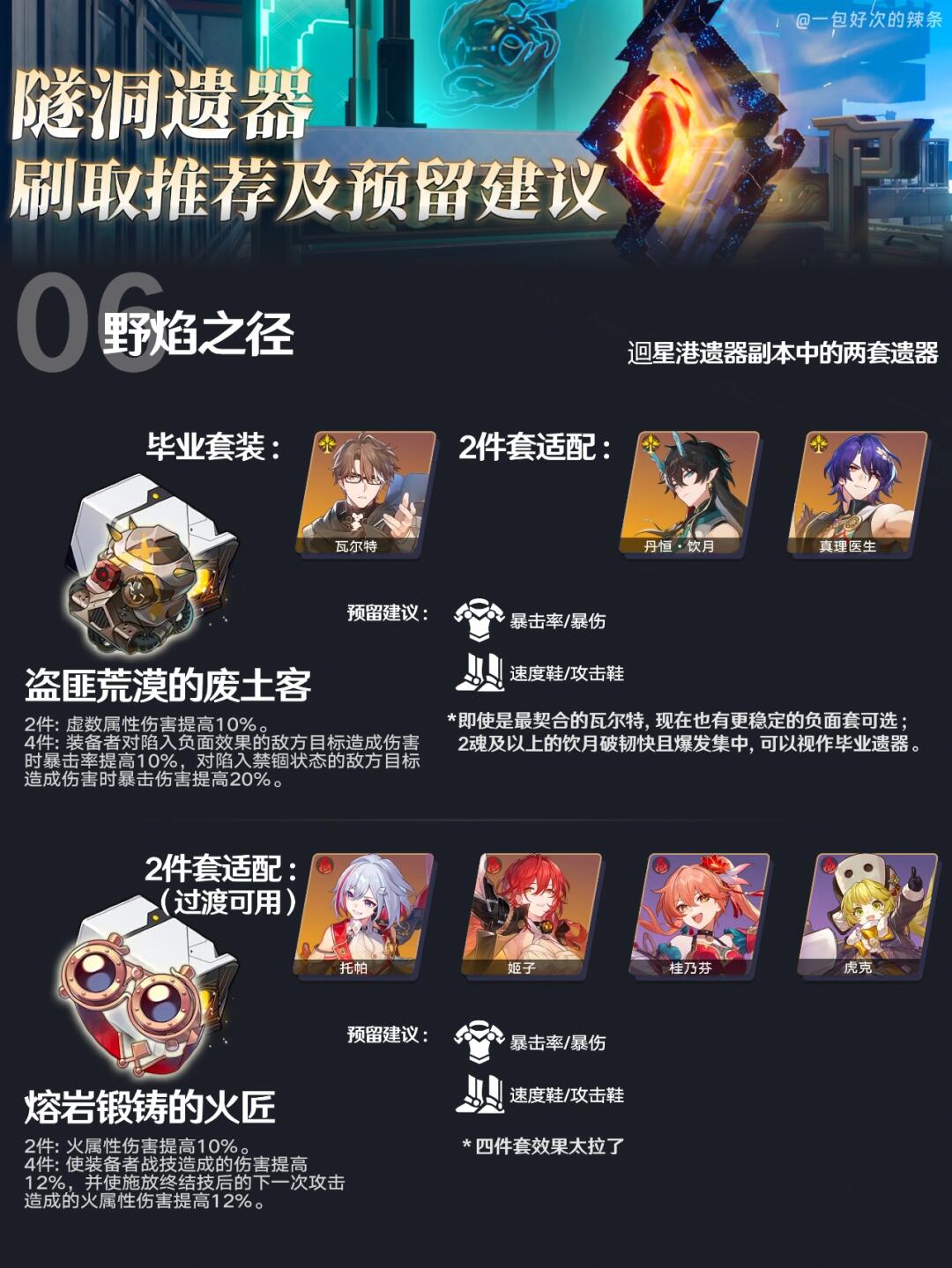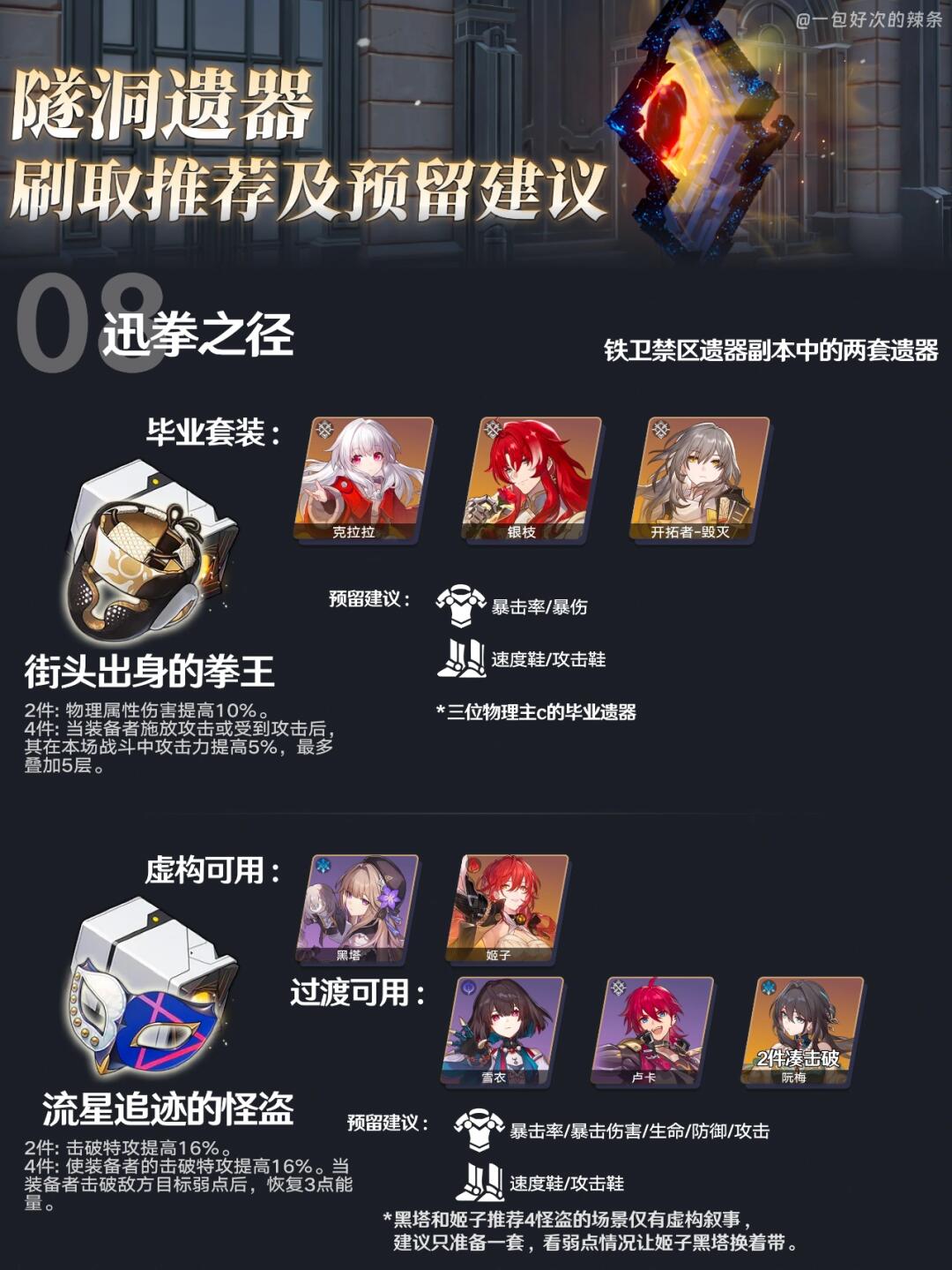 大家好,这里是一包好次的辣条! 这次的三倍掉落是明天(4.26)开始哦~ 惯例会以“毕业套装”和“过渡可用”区分输出角色不同遗器优劣, 主要是基于期望伤害和有效词条量的对比 ————————————— 如有遗漏/错误欢迎指出,共同进步~ 最近新玩家/回坑玩家多,大家友善讨论哦~ —————————————