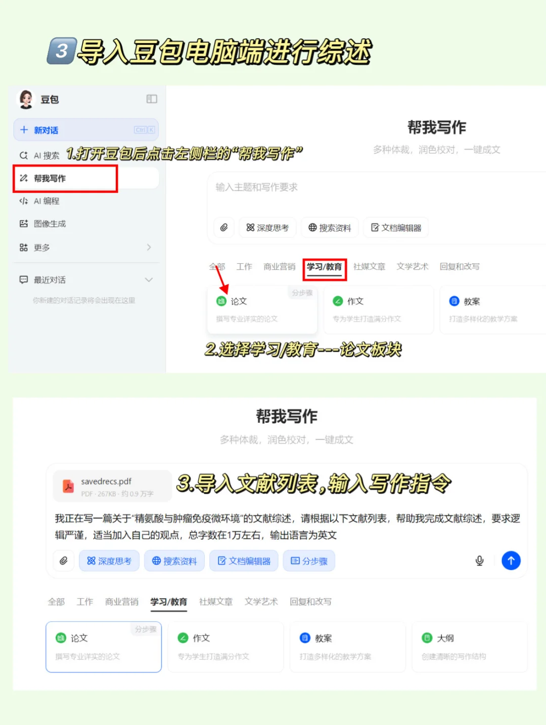 2️⃣ 将文献列表导入豆bao电脑端,输入指令:我正在写一篇关于“精氨酸与肿瘤免疫微环境”的文献综述,请根据以下文献列表,帮助我完成文献综述,要求逻辑严谨,适当加入自己的观点,总字数在1万左右,输出语言为英文
