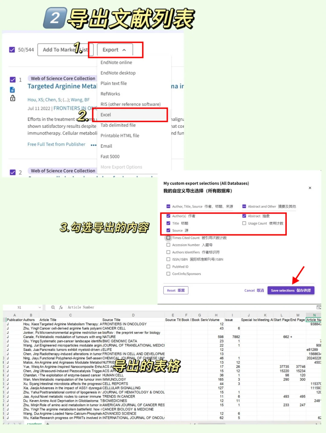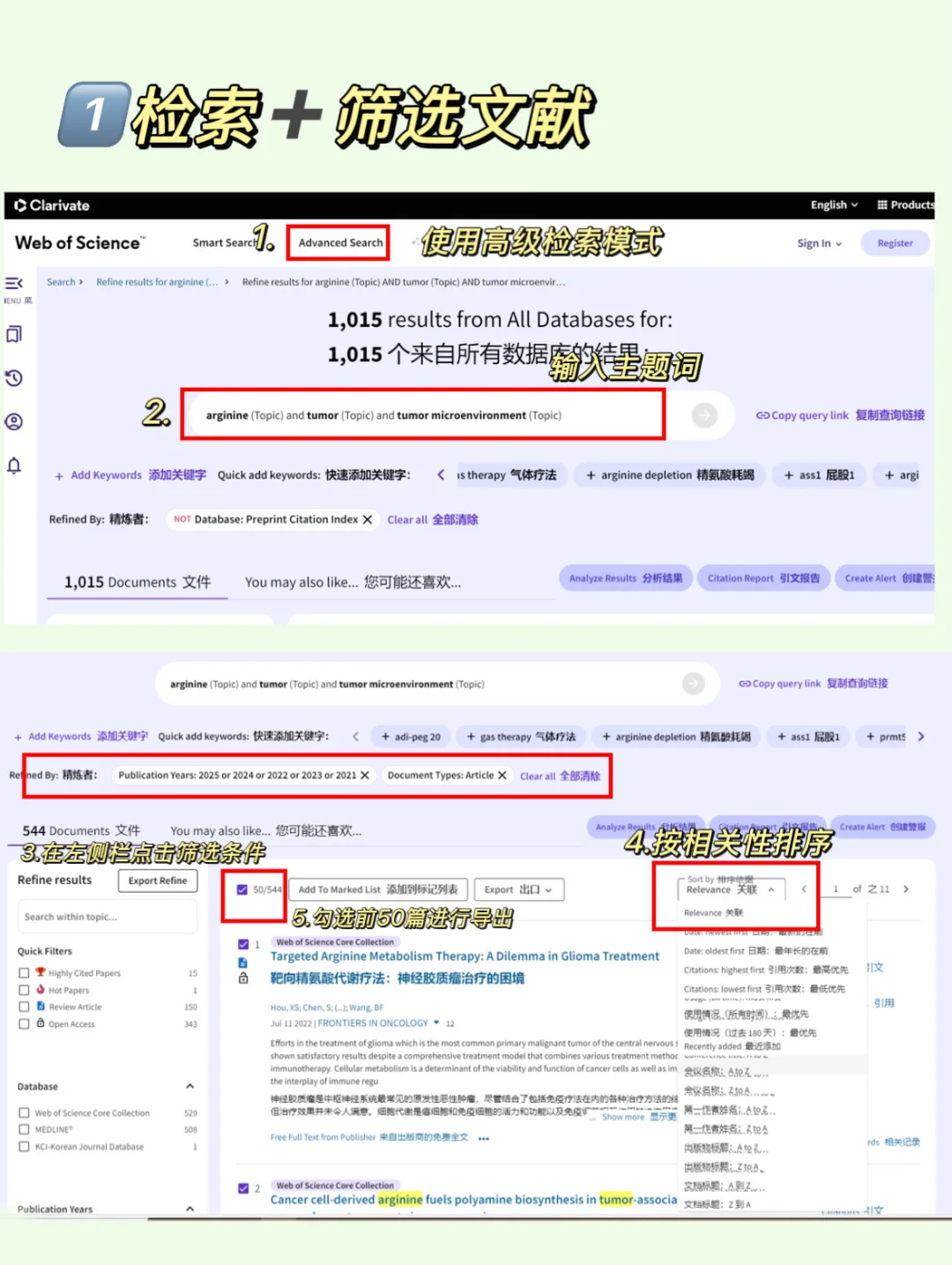 1️⃣ 先用web of Science数据库进行文献筛选,选择高度相关的文献,导出文献表格(详细步骤见图2-3)