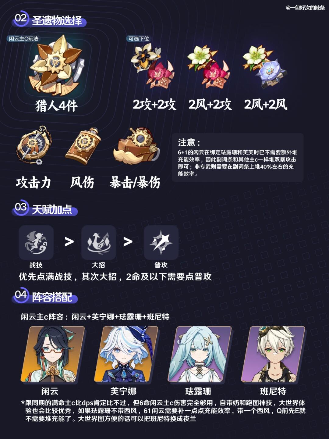 注意,本篇是闲云的主c玩法培养指南,虽然0-2命的闲云也有一定的输出能力,但是个人仅推荐真爱玩家作为一种娱乐玩法选择,0-2命的闲云可以刷一套备用的主c圣遗物,主要还是以奶辅闲云为主。 6命的闲云就直接化身主c,对比dps肯定不及同期其他满命主c,毕竟定位并非主c,而是奶妈+下落拐,胜在舒服且机制有趣。