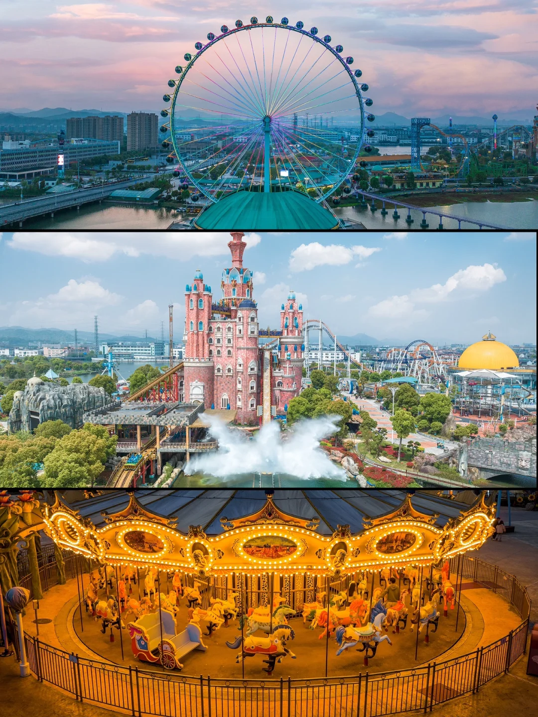 如果你觉得上海迪士尼太远而且人太多、那么来绍兴东方山水乐园吧、这里有和迪斯尼一样的魔法城堡、还有浪漫的摩天轮和几十种不同的游玩项目、夜场的旋转木马真的浪漫至极