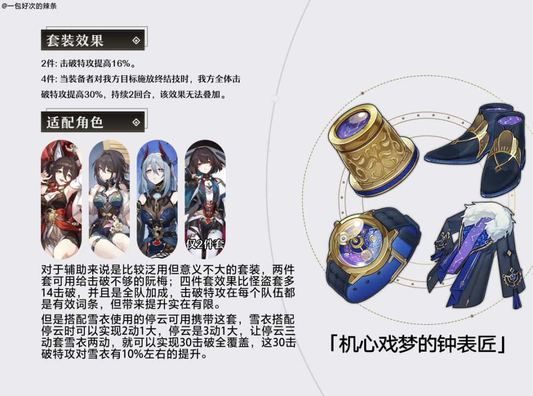 目前来看,最契合的角色是和雪衣组队的停云,雪衣搭配停云时可以实现2动1大,停云是3动1大,停云可以三动套雪衣两动,从而实现30击破的全覆盖,未来可能有其他需要堆击破特攻的五星主c,届时这套遗器的价值就会更高一些。