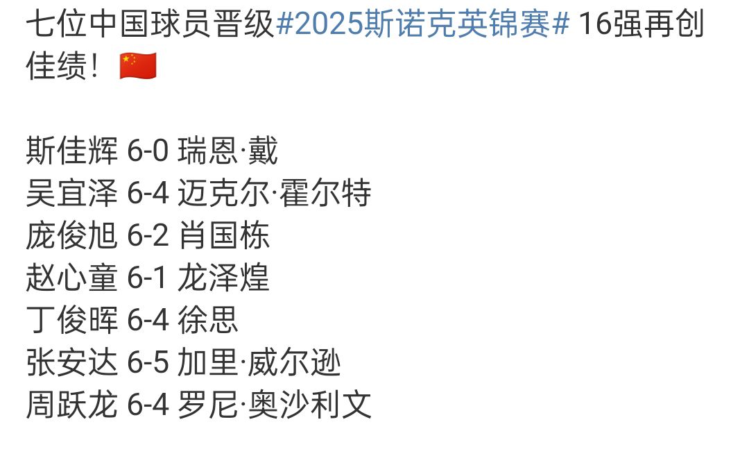 本届英锦赛中国选手惊喜不断,先是丁俊晖、赵心童、肖国栋、吴宜泽、斯佳辉五人作为种子球员参赛,创造一个新的纪录,随后张安达、周跃龙、庞俊旭、龙泽煌、吕昊天、雷佩凡、徐思七人通过资格赛脱颖而出,最终12位中国选手参加英锦赛的正赛(32强),整体表现明显超出预期。