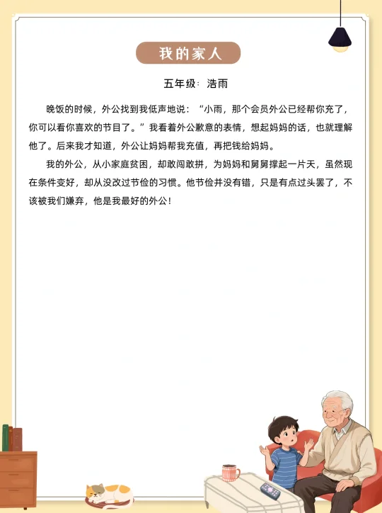 通过“外出吃饭”和“充值会员”两件小事,生动刻画了外公深植于骨的节俭习惯。 小作者以稚嫩却真诚的笔触,展现了代际观念差异下的家庭温情,更难能可贵的是在矛盾中实现了理解与共情。 从抱怨到体谅,从争执到感恩,最终升华到对长辈人生经历的深刻认知,这是真正的成长。 文字朴实却饱含力量,让我们看到节俭背后,是时代刻印的生命印记与深沉的爱。