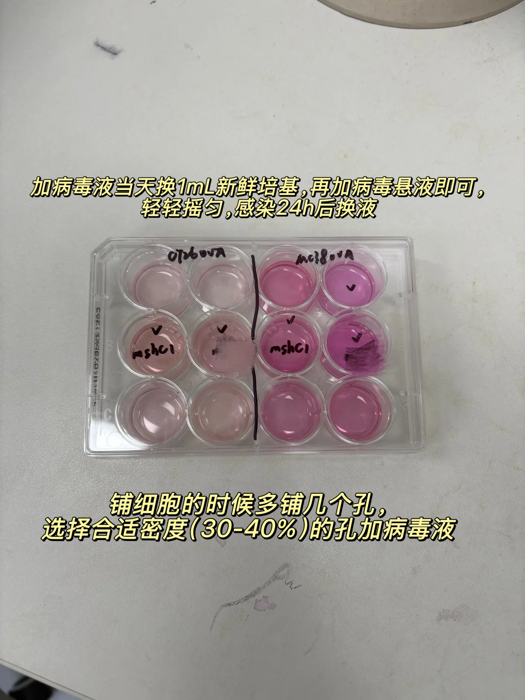 有些细胞感染病毒后状态会变差,不要着急加药筛选,等细胞状态稳定后再加;感染病毒我一般用12孔板,加病毒液48h后如果质粒带荧光标签可以直接用荧光显微镜看阳性率,在12孔板长满后大部分转移至中号培养瓶,小部分铺6孔板(收蛋白跑wb),这个时候就用加药的培养基培养了,阴性细胞会噶掉,剩下的都是阳性细胞,所以感染阳性率越高留下的细胞越多~