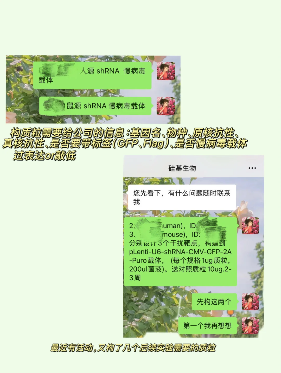 质粒构建:质粒成功构建是第一步,构质粒我一般交给公司,这个一定要找一家靠谱的公司,之前遇到过构的质粒根本表达不出来,这两年我都在硅基生物构的质粒,敲低和过表达都很ok,最近有活动又构了几个