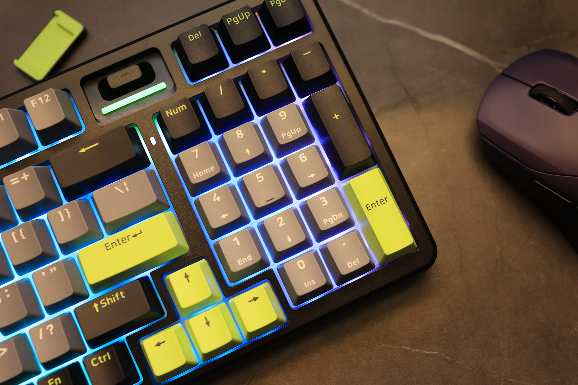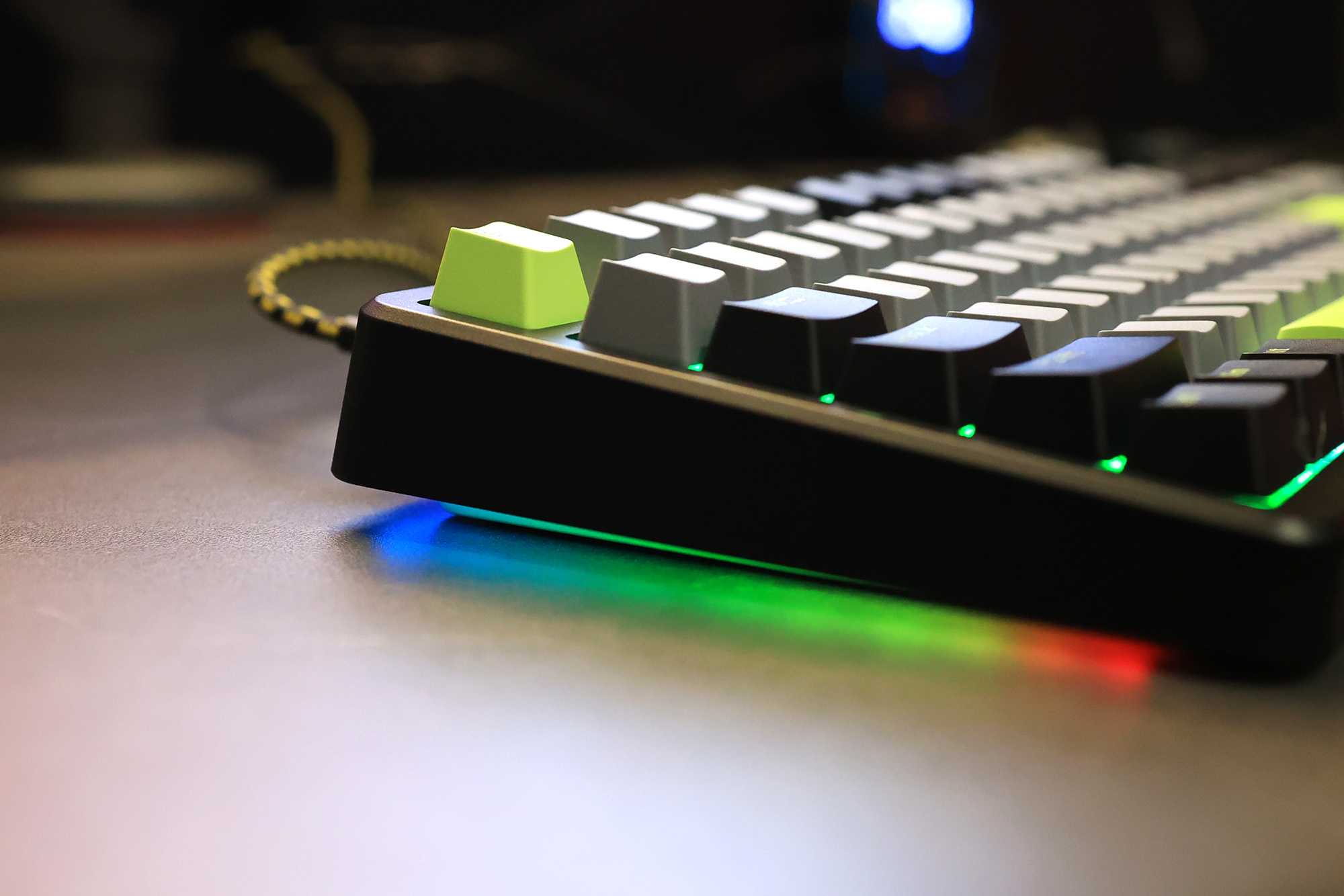 先来聊聊这款键盘吧,299元的价格,和日常多数的游戏键盘的价格基本类似。我选择了一个灰黑绿相间的颜色,主要是觉得比较耐脏,而且绿色起到了一点装饰作用,科技感满满,无论是放在工位还是家里,至少都不会觉得突兀。底部键盘背景灯亮起那一刻就觉得一个字,帅!