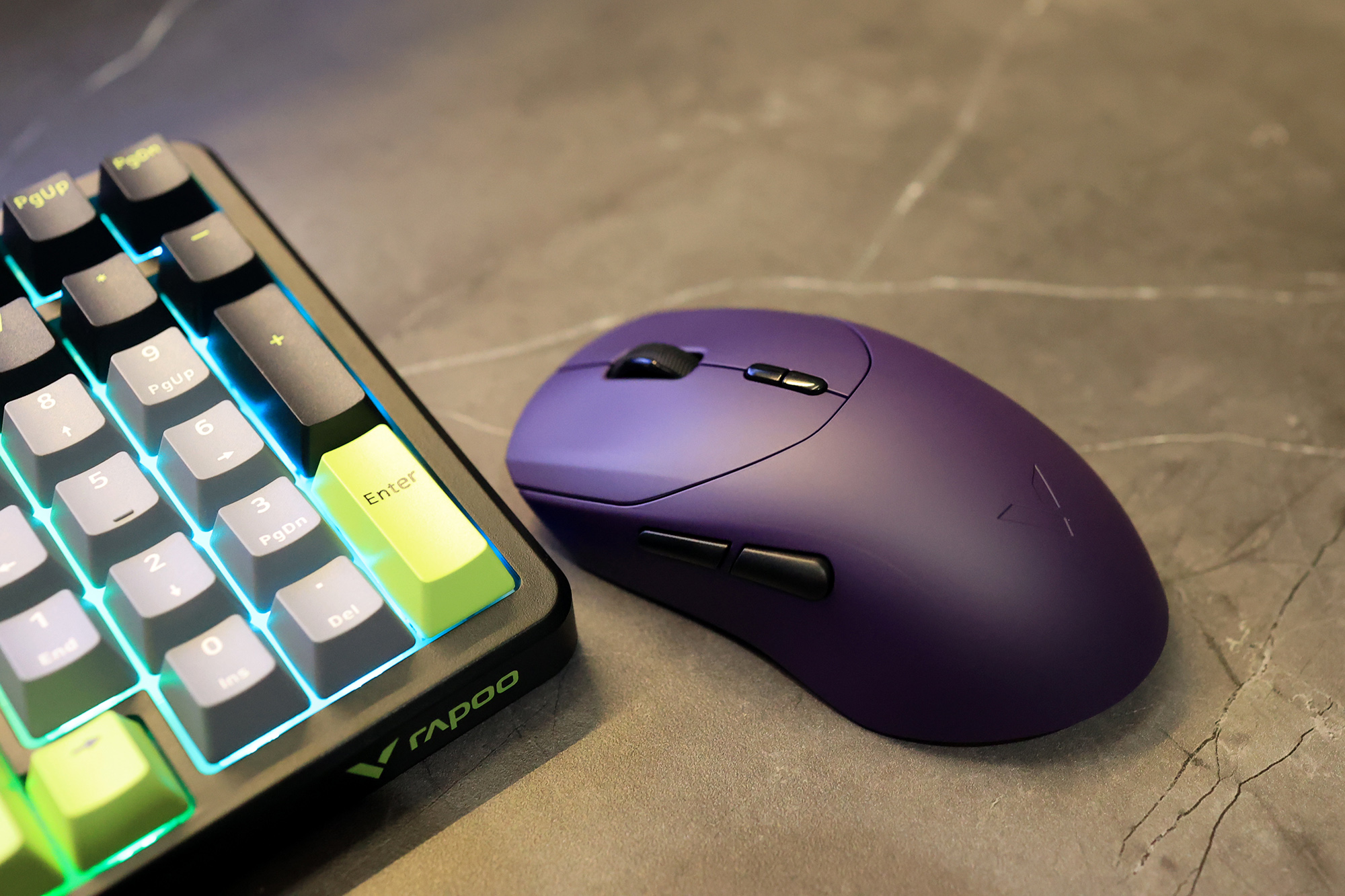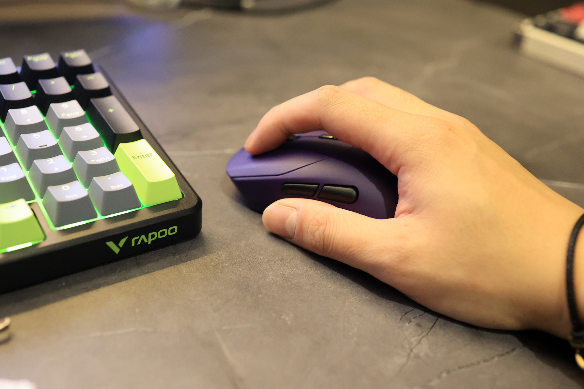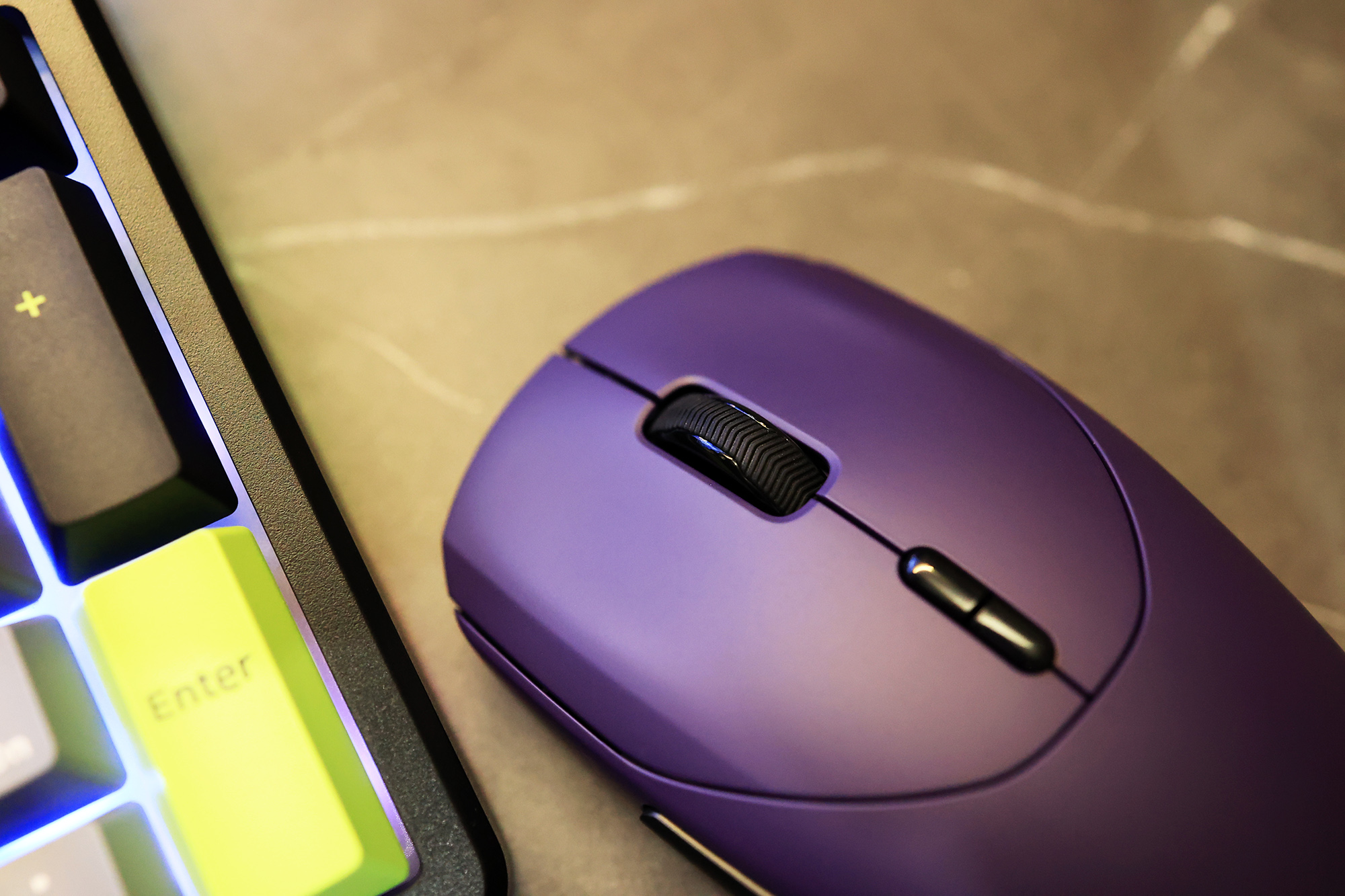 好马配好鞍,只有键盘可不行,“妹妹说紫色很有韵味”,搭配紫色的雷柏VT9 MAX无线鼠标,才能玩的更爽。这款鼠标的尺寸适用中大型手,别看它大,但是重量上只有53g,表面也用了亲肤防滑涂层。