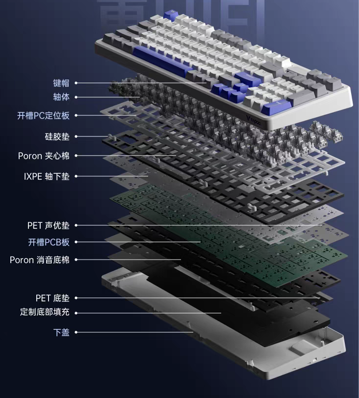 还有一点想要说的就是键盘结构。其实这个键盘拿到手上的第一感觉就是很厚实,虽说机械键盘都很重,但是它在结构上是明显下了功夫的。首先Gasket板簧结构能提供更柔和、均匀的按键触感,并减少共振。然后用了7层消音材料,比市面上常见的5层填充效果更好。最后结合横向开槽的PC定位板,多层结构搭建出一个稳定的按键框架。