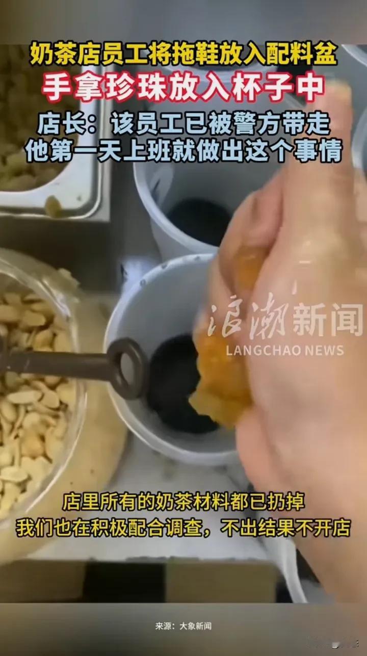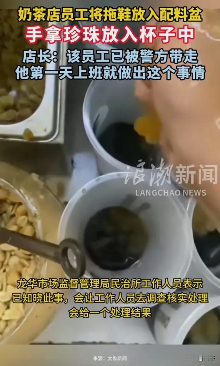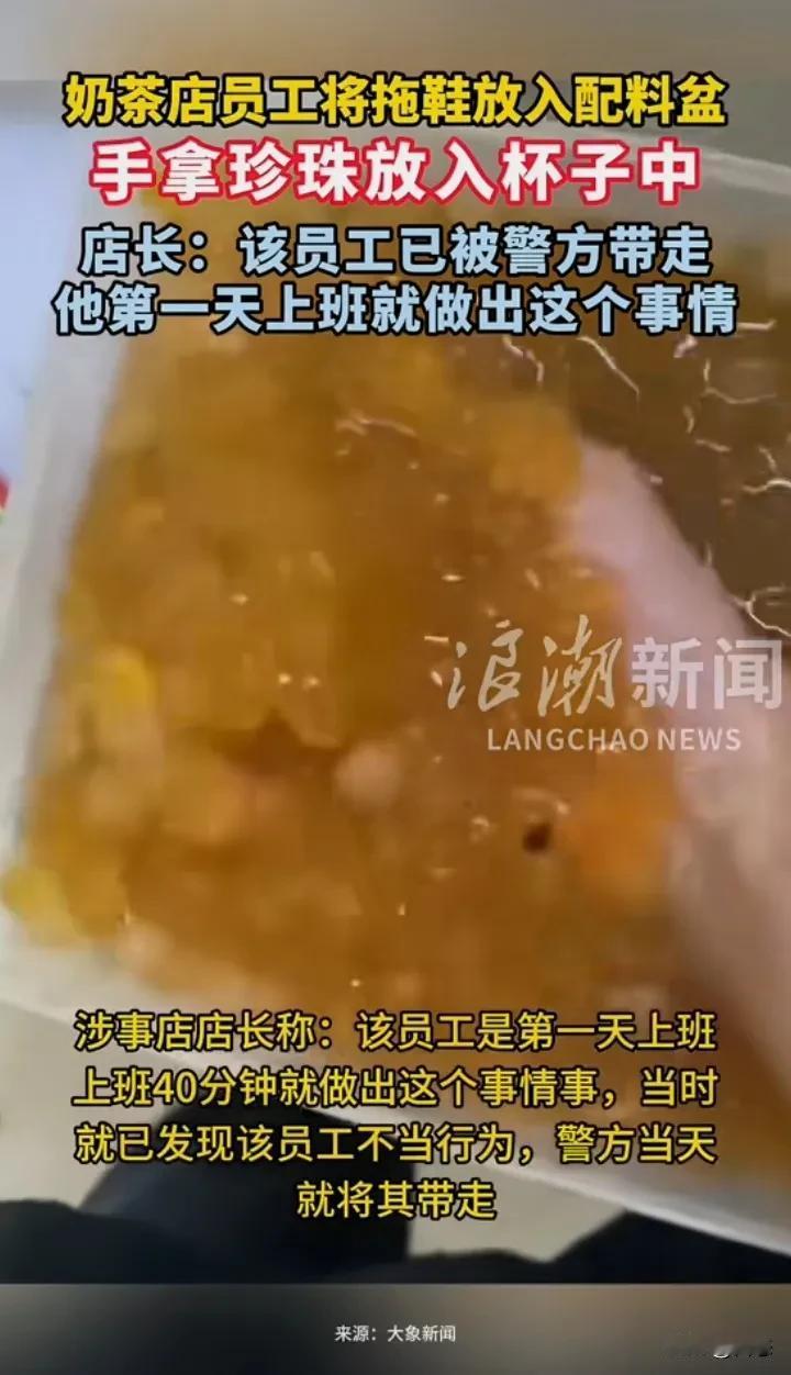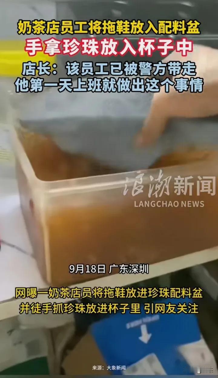 匪夷所思,广东深圳一奶茶店员工将拖鞋放入配料盆里面,还手拿珍珠放入杯子中,视频被曝光后。在网上引起广大热议和气愤。 店长称,员工已经被警方带走。店长也没想到第一天就做出这样的事。 不知道这种人是什么心理,心理是不是太扭曲了。 必须严惩,不然还会做出什么事来。你们怎么看这样的人呢?