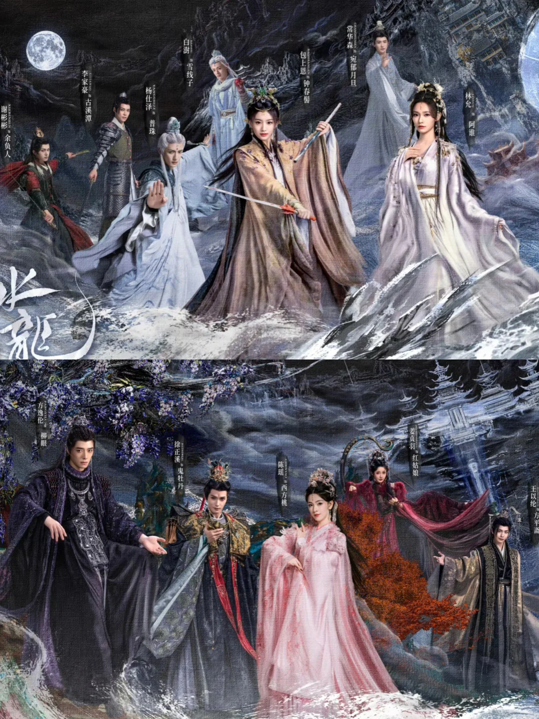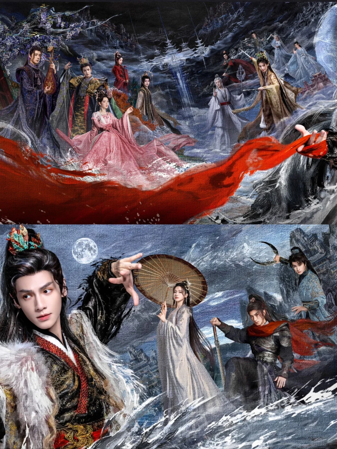 被《水龙吟》海报震撼到失语!罗云熙一袭华衣倨傲立于画面中央,赤色绸缎翻涌如血浪,与巍峨水龙交缠直冲云霄,每一片龙鳞都泛着冷冽的水光!身后鬼牡丹的傀儡丝线操控西方桃,配角阵营剑拔弩张的对立感张力拉满,画面却丝毫不乱——岩彩画的矿物颗粒叠加深邃光影,水墨泼洒的江湖底色里,浮现金箔般的奢靡浪漫,像老港漫的武侠封面混搭动漫燃魂特效,神秘瑰丽到窒息!