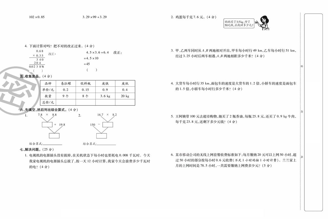 2025秋人教版数学五年级上册第一单元综合测试卷