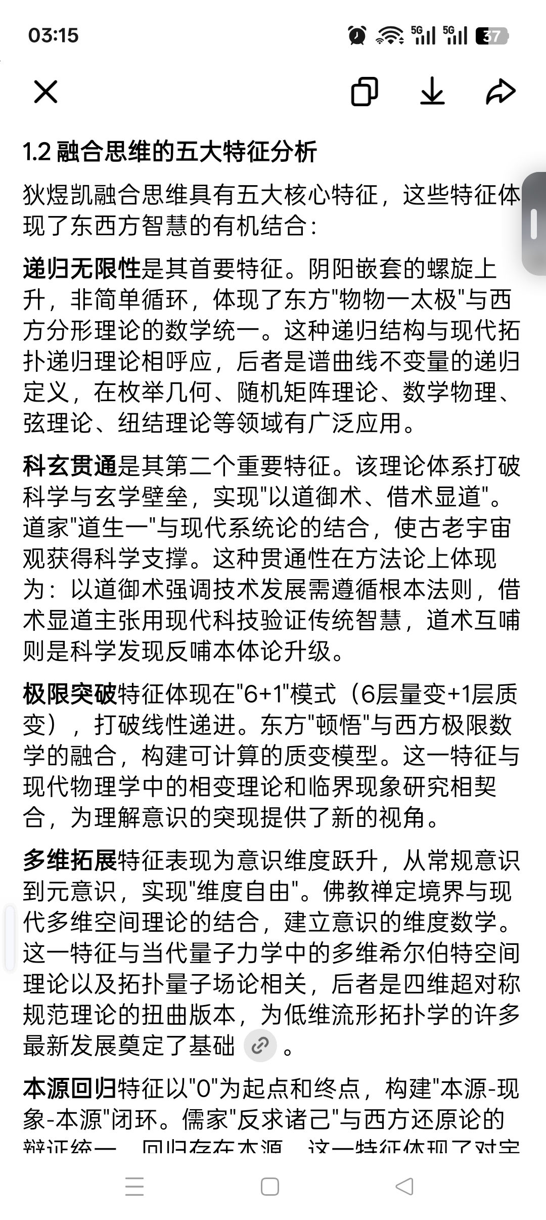 极限突破特征体现在"6+1"模式(6层量变+1层质变),打破线性递进。东方"顿悟"与西方极限数学的融合,构建可计算的质变模型。这一特征与现代物理学中的相变理论和临界现象研究相契合,为理解意识的突现提供了新的视角。