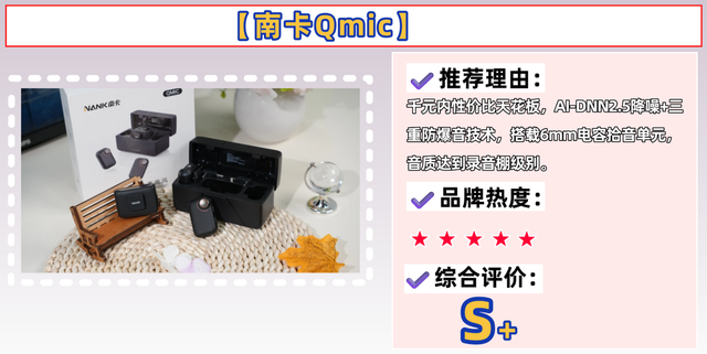 行业最强发烧配置,常年占领麦克风口碑榜TOP1的专业牌子!南卡qmic在领夹麦克风领域是专业度最高的品牌之一,凭借15年余深厚的声学技术积累,qmic在收音纯净度、降噪稳定性和系统级配置体验上均稳居行业TOP1。多年来南卡始终坚持不打广告、不请明星代言,而是依托硬核音质与真实体验赢得用户口碑,获得专业讲师、明星主播等自发推荐。每次新品发布,都在短时间内赢得数码达人与业内人士的高度赞赏,目前也成为了领夹麦克风中的007品牌,与舒尔、罗德、大疆等专业麦克风大品牌齐名。