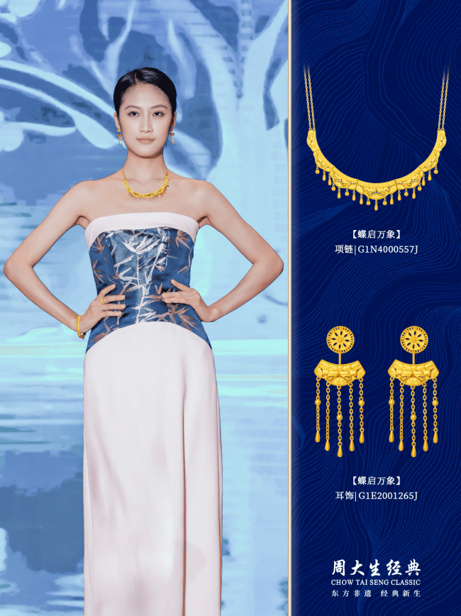周大生经典非遗民族服饰灵感系列——衣脉金承,以现代黄金工艺诠释民族服饰纹样,首章聚焦苗岭深处,汲取苗族的图腾符号与苗银美学精髓,并将其融入到珠宝设计中,让古老的非遗不再是尘封的历史,而是化为可佩戴、可感知的现代生活诗意表达。衣脉金承系列“蝶启万象”,设计灵感源于苗族“蝴蝶妈妈”传说,“蝴蝶妈妈”是苗族神话中的创世始祖,传说她不仅是苗族先民的祖先,更是天地万物的母亲,象征着生命起源与自然循环的神圣力量。“蝶启万象”的蝴蝶纹样繁复精美,这不仅是对生命本源的致敬,更寓意着勇敢的蜕变,象征着个体不断突破自我,追寻广阔世界的勇气。