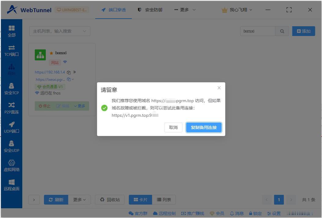 各位老铁在添加网站映射的时候,是否会遇到刚添加时无法打开的情况 或者域名被单位拦截等 考虑到大家的实际使用场景,WebTunnel 开放了网站访问的两种方式 默认推荐使用域名访问,如果域名无法打开,则可以使用备用方式 备用方式是 tcp 方式,一般前者无法打开时,备用方式都可以。(除非是根本没有穿透成功) 无需更新客户端,刷新即可体验