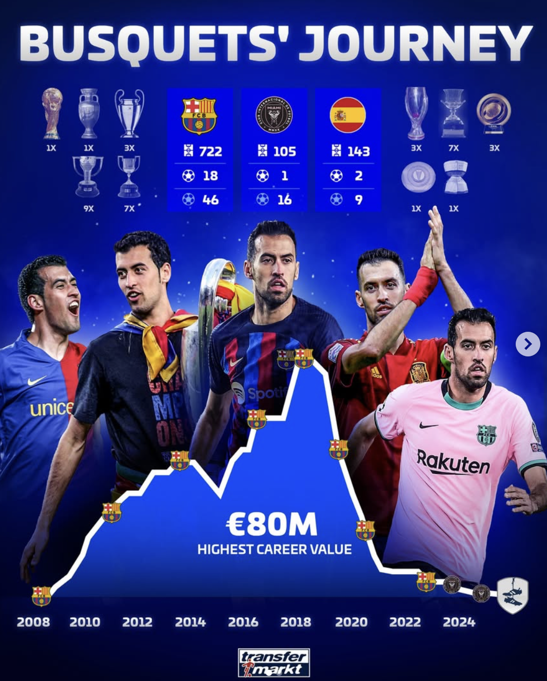 布斯克茨职业生涯:身价最高达8000万;970场比赛获36座冠军