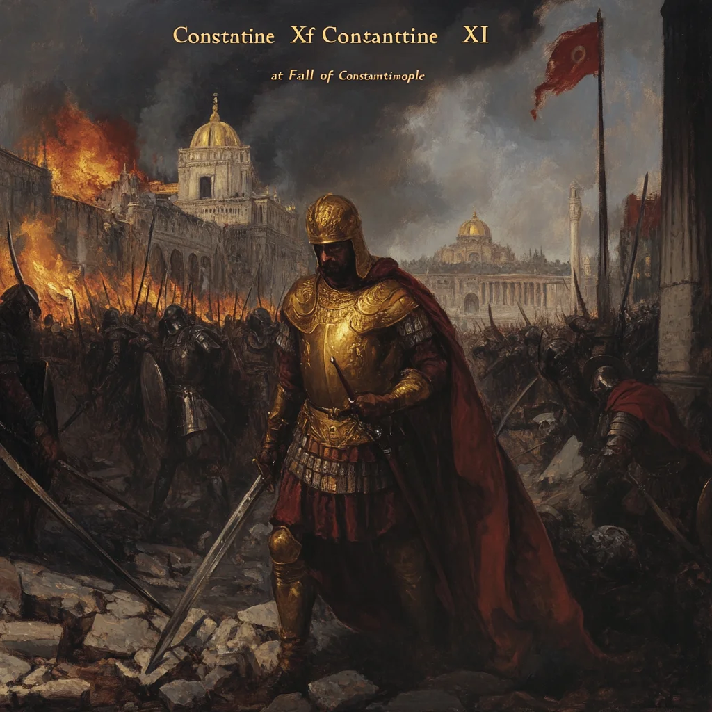 1453年,奥斯曼帝国的苏丹穆罕默德二世(“征服者”)率领强大的军队围攻君士坦丁堡。尽管处于孤立无援、兵力悬殊的困境中,君士坦丁十一世拒绝投降,亲自指挥防御战。他表现出极大的勇气,坚守到最后时刻。