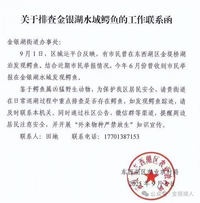 评论区中,有网友发布了一张来自某微信公众号的《关于排查金银湖水域鳄鱼的工作联系函》,该函落款单位为武汉市东西湖区农业农村局。函件中提到,有市民曾在东西湖区金堤桥湖泊发现鳄鱼,6月份也曾收到市民举报在金银湖水域发现鳄鱼。