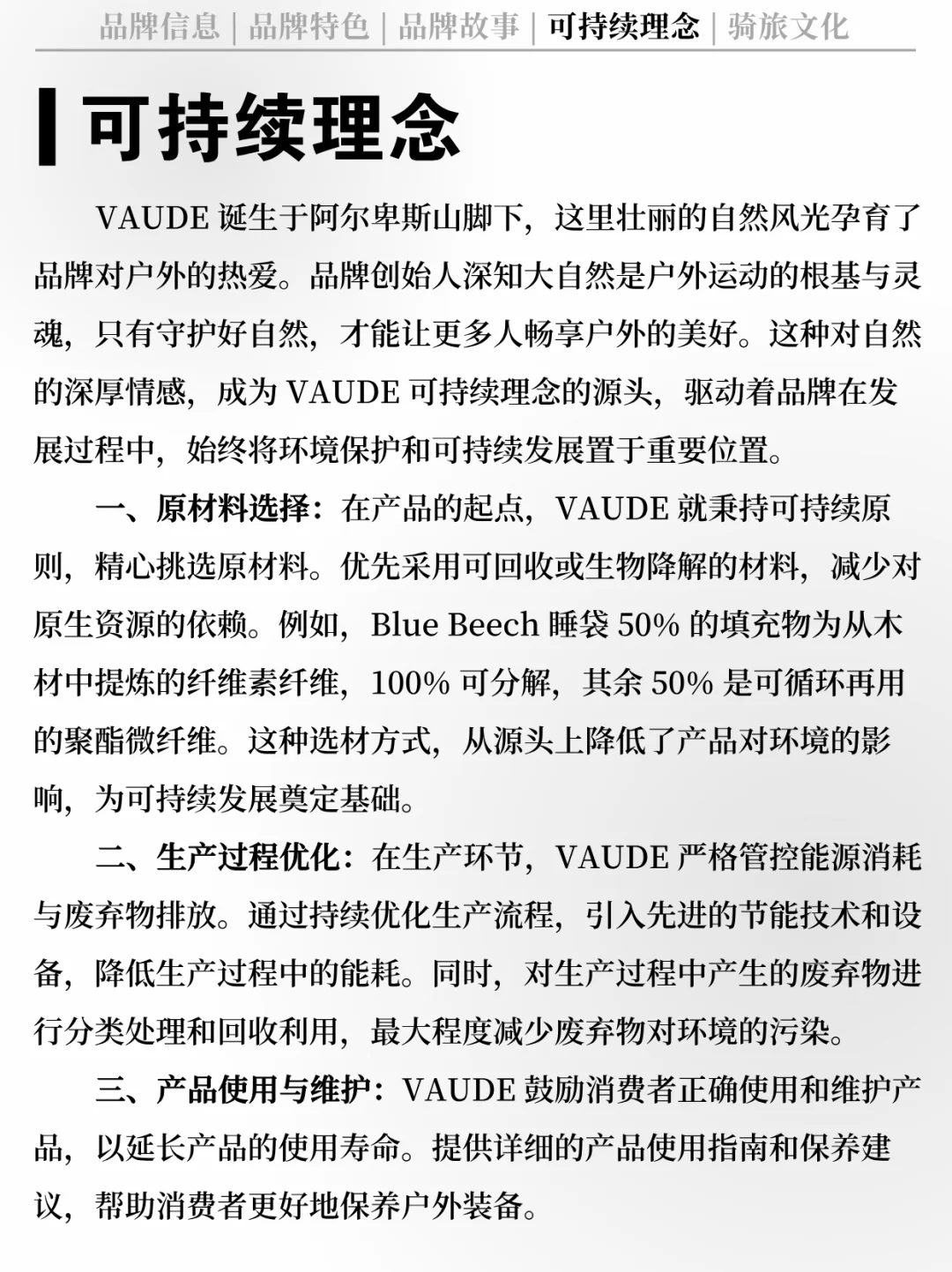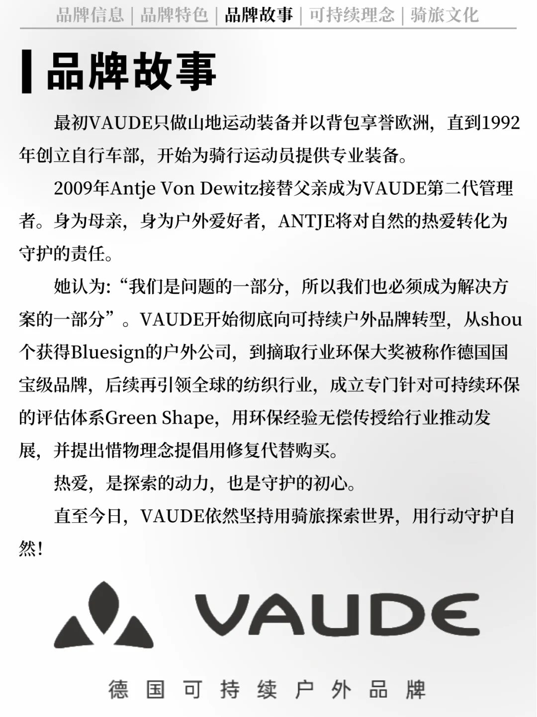 [种草R] 品牌故事:最初VAUDE只做山地运动装备并以背包享誉欧洲,直到1992年创立自行车部,开始为骑行运动员提供专业装备。[斜眼R] 2009年Antje Von Dewitz接替父亲成为VAUDE第二代管理者。身为母亲,身为户外爱好者,ANTJE将对自然的热爱转化为守护的责任。她认为:“我们是问题的一部分,所以我们也必须成为解决方案的一部分”。[向右R] VAUDE开始彻底向可持续户外品牌转型,从shou个获得Bluesign的户外公司,到摘取行业环保大奖被称作德国国宝级品牌,后续再引领全球的纺织行业,成立专门针对可持续环保的评估体系Green Shape,用环保经验无偿传授给行业推动发展,并提出惜物理念提倡用修复代替购买。热爱,是探索的动力,也是守护的初心[红色心形R]。