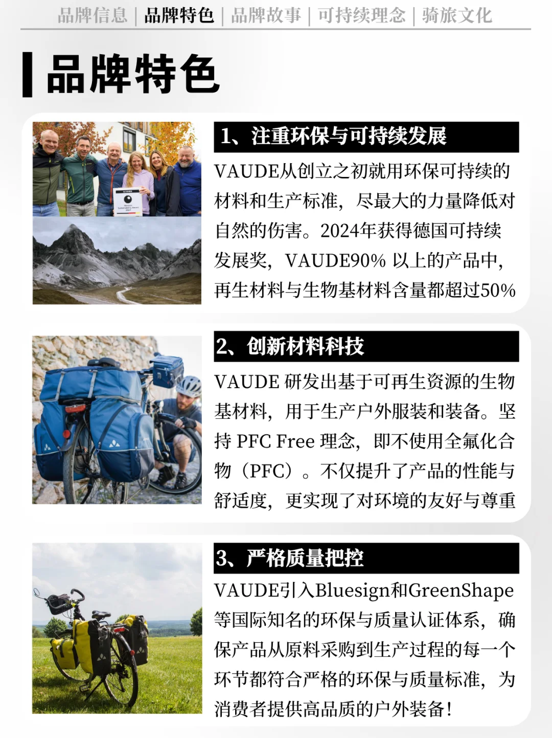 [火R] 品牌理念:源自德国,骑行探索,1974年VAUDE 诞生于阿尔卑斯山脉,延续山地精神,传承德系精工,守护自然,永续共生。