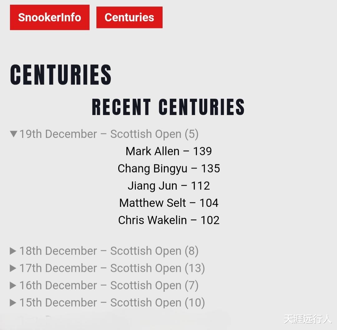 苏格兰公开赛8进4轮次,打出五杆单杆破百,常冰玉、周跃龙各打了一杆,本届苏格兰公开赛破百杆数来到61杆,常冰玉已经完成了八杆破百,赵心童的单杆146则暂居单杆最高分。