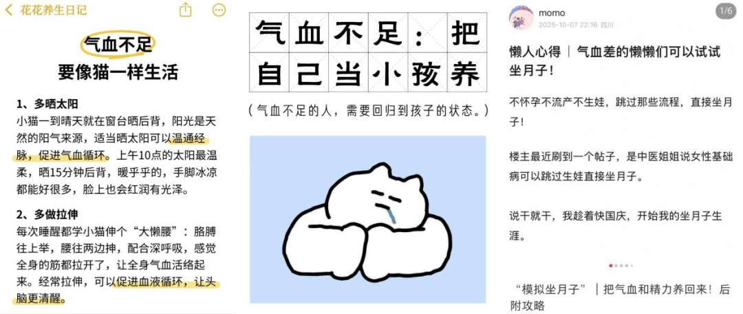 网上很多补气血建议:像猫一样生活、把自己当小孩养、模拟坐月子。