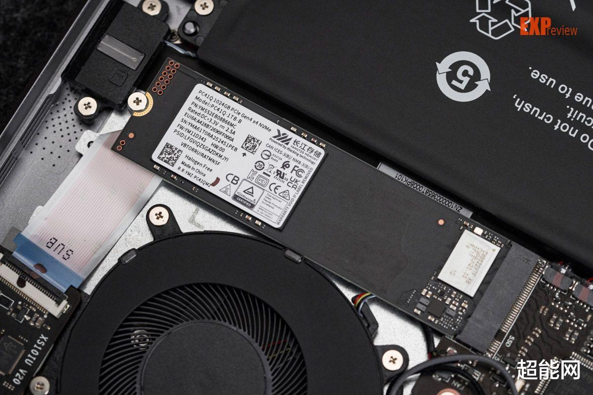 所配的SSD是长江存储的PC41Q 1TB,这款SSD在笔记本上很常见,Q就是QLC的意思,它采用长江存储第四代QLC 3D NAND闪存X3-6070,连续读写速度能到5700/5500MB/s,是一款性能还不错的QLC SSD。