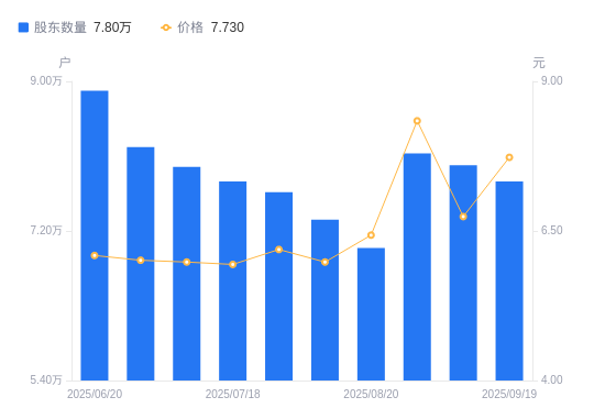 日期A股户数(户)流通A股户均持股数(股)户均持股市值(万元)2025-09-197796117882.9513.822025-09-107989917449.1911.762025-08-298131817144.7014.302025-08-206995719929.0012.812025-08-087334419008.6811.372025-07-317667018184.0711.262025-07-187794117887.5410.632025-07-107969517493.8610.462025-06-308210716979.9510.202025-06-208887715686.549.55