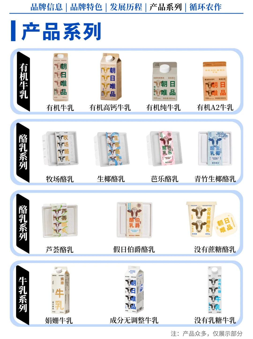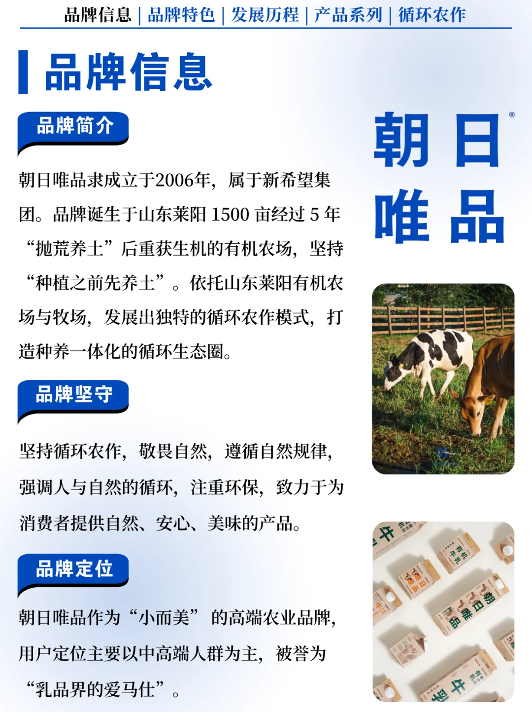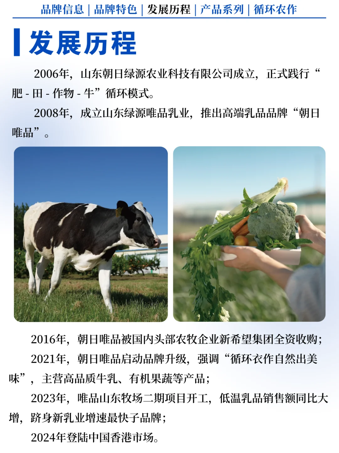 [烟花R] 发展历程:2006年,山东朝日绿源农业科技有限公司成立,正式践行“肥 - 田 - 作物 - 牛”循环模式。2008年,成立山东绿源唯品乳业,推出高端乳品品牌“朝日唯品”;[斜眼R] 2016年,朝日唯品被国内头部农牧企业新希望集团全资收购;2021年,朝日唯品启动品牌升级,强调“循环衣作自然出美味”,主营高品质牛乳、有机果蔬等产品;2023年,唯品山东牧场二期项目开工,低温乳品销售额同比大增,跻身新乳业增速最快子品牌;[赞R] 2024年登陆中国香港市场。