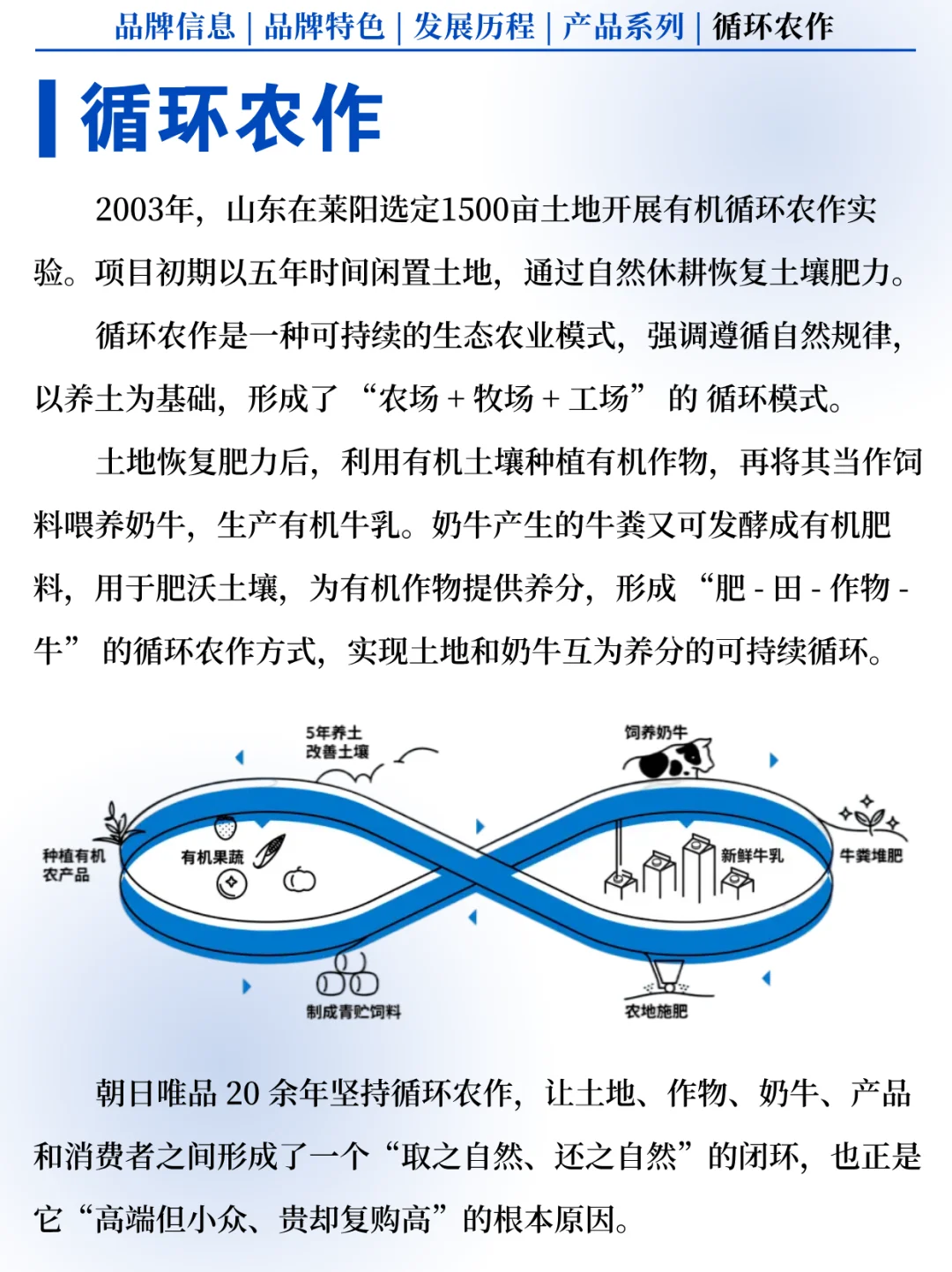 [向右R] 总的来说,朝日唯品之所以被称为 “乳品界的爱马仕”,源于其如奢侈品般对品质的极致追求 —— 从山东莱阳 1500 亩土地抛荒 5 年养土的耐心,到以 “肥 - 田 - 作物 - 牛” 循环农作模式构建的有机生态链,不施化肥农药、人工呵护作物,再到引进纯种荷斯坦奶牛并科学喂养,搭配日本 ESL 技术等高标准工艺,产出通过双重有机认证的高品质牛乳,每一环都彰显着对自然与品质的坚守,如同爱马仕对工艺与材质的执着,使其成为高端乳品的代表品牌。