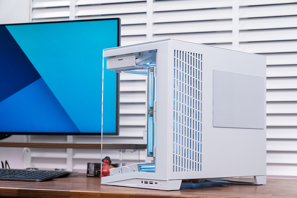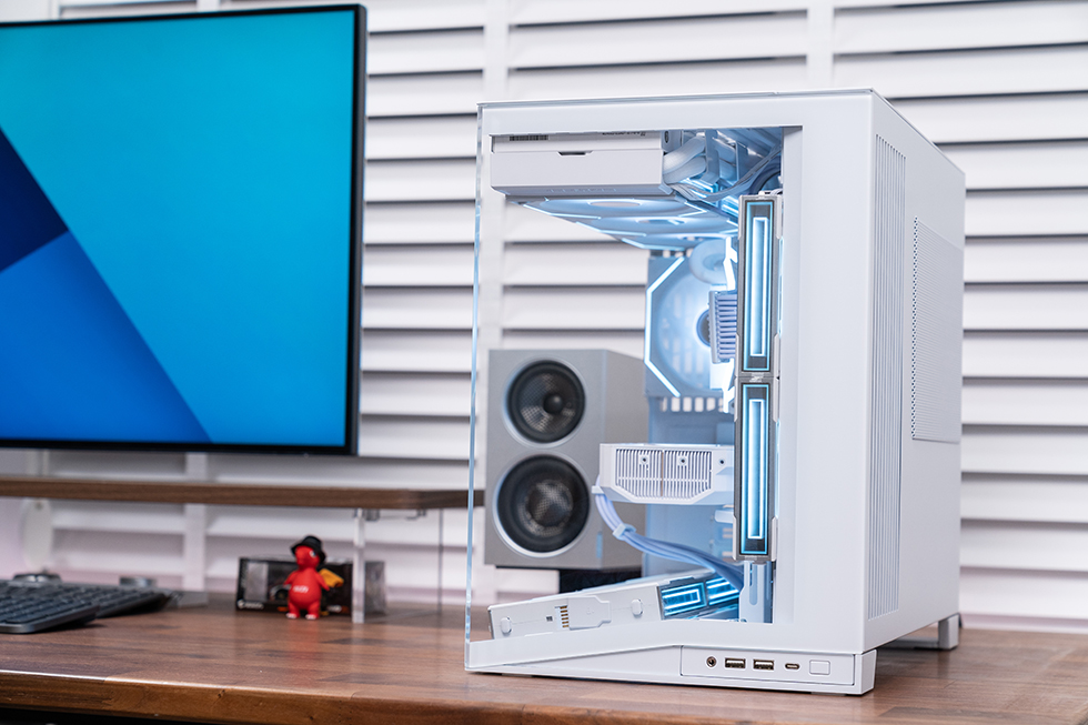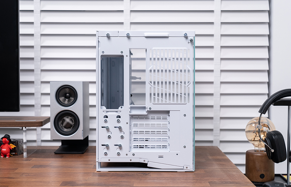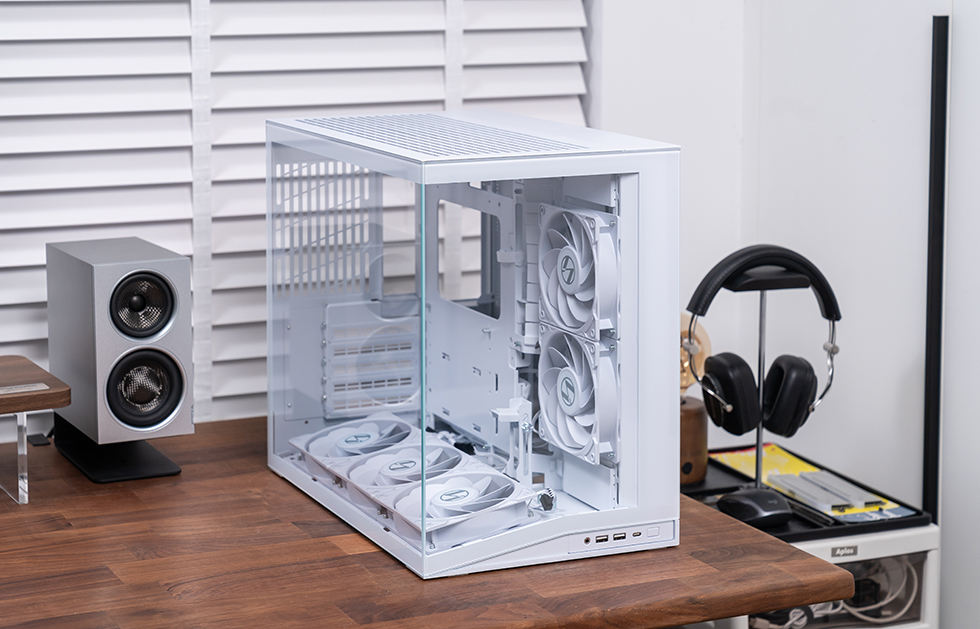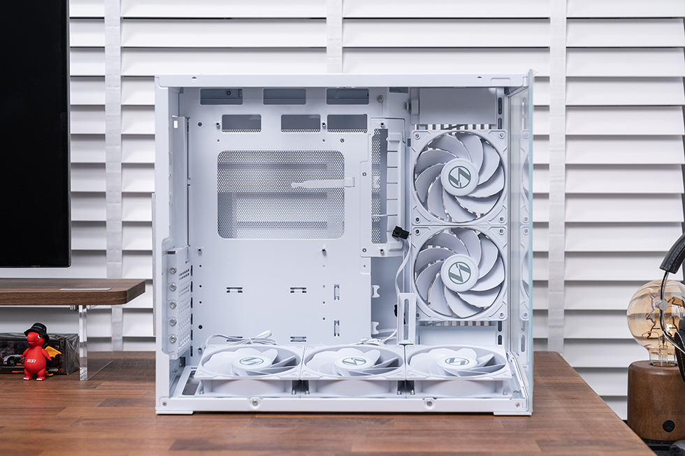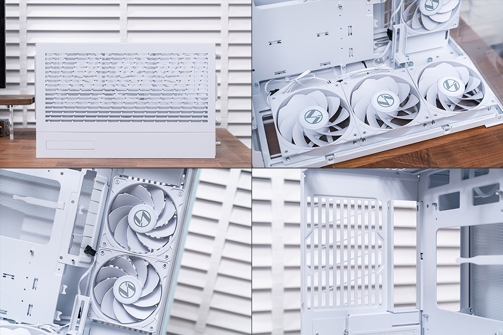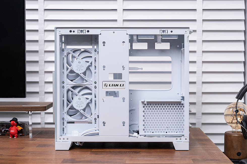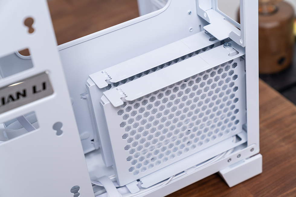 模块化设计让装机过程充满弹性:顶部水冷支架与底部风扇支架均可拆卸,配合背部丰富的走线槽与 24Pin 线缆限位器,理线难度大幅降低,即使搭配联力 SX1000P 这类全模组电源,也能实现整洁的内部布局。硬盘安装同样便捷,可开合式硬盘笼支持 2 个 3.5 英寸 HDD+2 个 2.5 英寸 SSD 的组合。