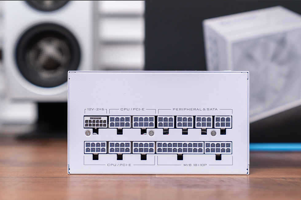 AC输入接口和风扇智能停启都带有独立开关。全模组接口区的布局规整,提供1组24Pin 主板接口,5 组 CPU/PCIe 8Pin 接口,4组SATA 与 Molex 接口和1组12V-2x6接口,接口标识清晰,即使新手装机也能快速区分线缆用途。