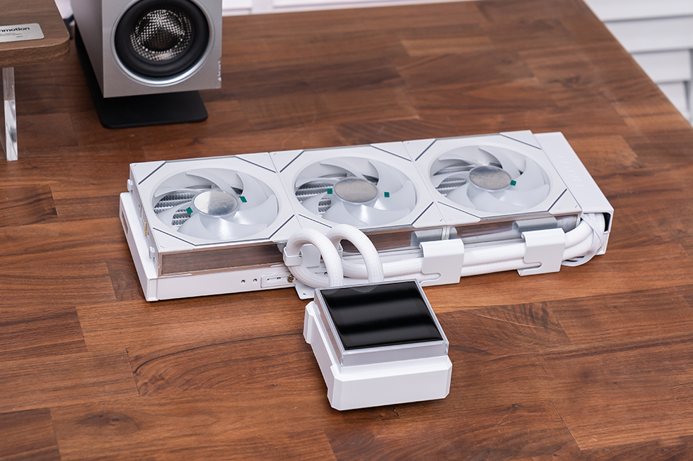隐流二代360 LCD版本提供三种不同型号以满足用户偏好与性能需求:无风扇版本供自行选配风扇的用户选择;UNI FAN CL Wireless版实现散热性能与美学的平衡;UNI FAN TL Wireless型号则提供最大风量与散热效能。为了统一光效配备了联力 INF120 wireless积木风扇三代无线版,采用FDB液压轴承,7扇叶设计,提供风量达61.3CFM,风压达2.66 MMH2O,转速区间0,200-2300RPM,最小噪音为29DbA。
