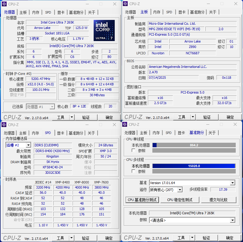 采用 英特尔 酷睿 Ultra 7 265K + 微星 MPG Z890 刀锋钛 主板为核心平台,Ultra 7 265K,20 核 20 线程,基础频率 3.9 GHz,最大睿频 5.5 GHz、二级缓存 36 MB,三级缓存 30 MB。创新的chiplets分离式模块化架构通过D2D(Die-to-Die)高速互联通道,实现了对异构计算模块的精准超频调控,相对于溢价严重的AMD X3D系列,可谓极具性价比。