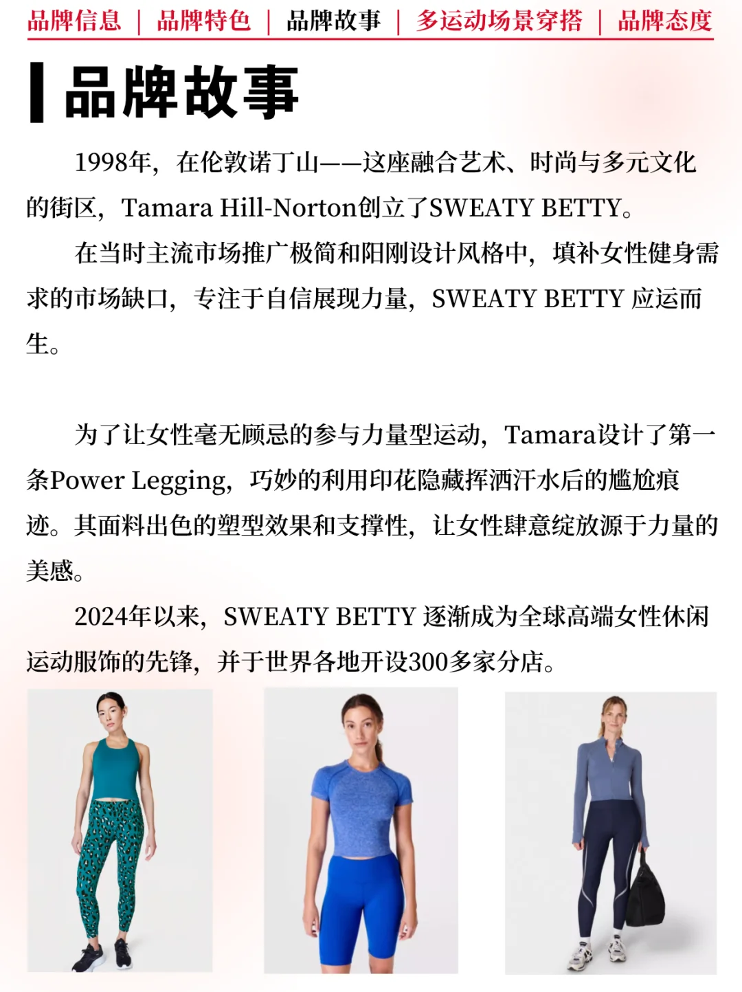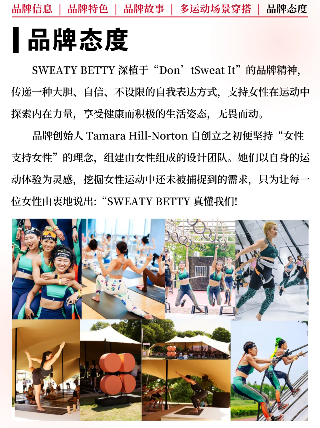 [向右R] 品牌简介:SWEATY BETTY 于1998年由Tamara Hill-Norton夫妇在英国伦敦创立,是专注于高端女性运动服饰的时尚品牌。