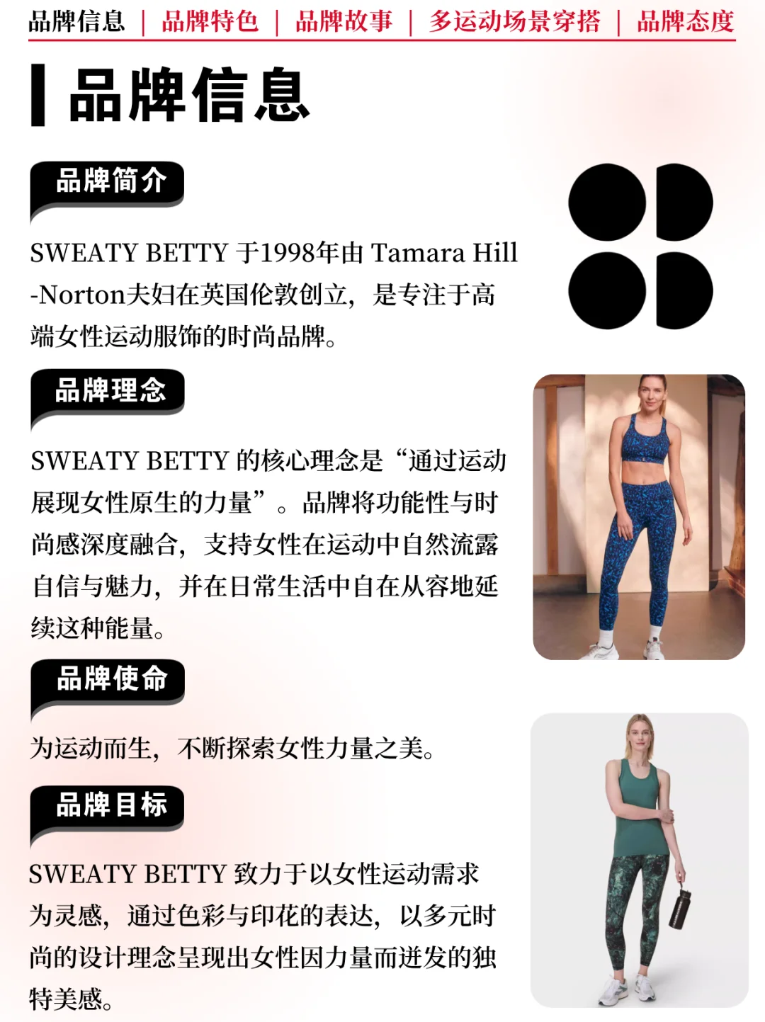 📌 品牌目标:SWEATY BETTY 致力于以女性运动需求为灵感,通过色彩与印花的表达,以多元时尚的设计理念呈现出女性因力量而迸发的独特美感。