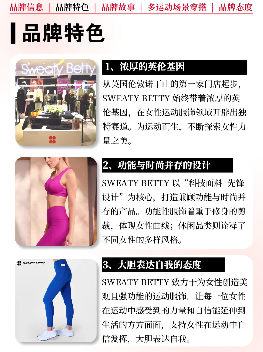 🤾♀️ 品牌理念:SWEATY BETTY 的核心理念是“通过运动展现女性原生的力量”。品牌将功能性与时尚感深度融合,支持女性在运动中自然流露自信与魅力,并在日常生活中自在从容地延续这种能量。