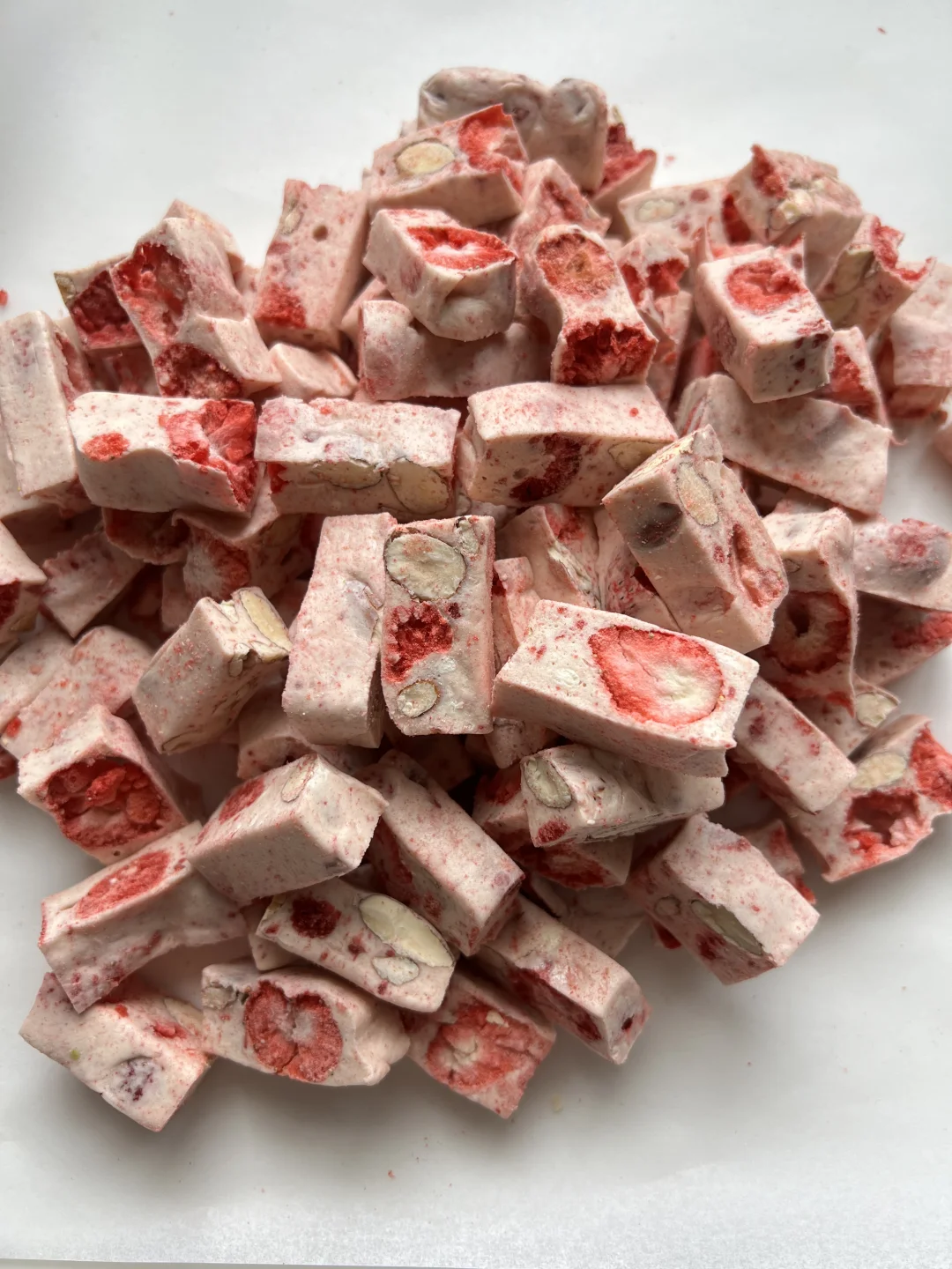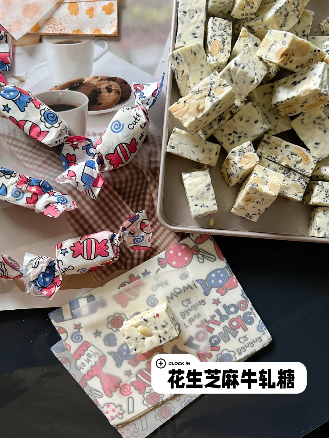 5️⃣放进不粘烤盘,借助擀面杖和定型方木条擀平整理形状,放入冰箱冷藏半小时后切块,裹上糯米纸,包上糖纸就完成啦~~