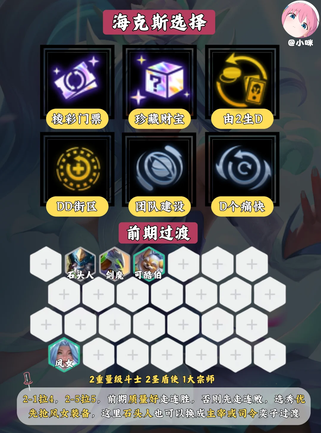 2️⃣阶段2-1拉4,2-5拉5,前期质量好就走连胜,质量差就走连败顺便抢风女装备,过渡方法上图只是参考,石头人可以换纳亚菲利开主宰,炸弹人开司令等