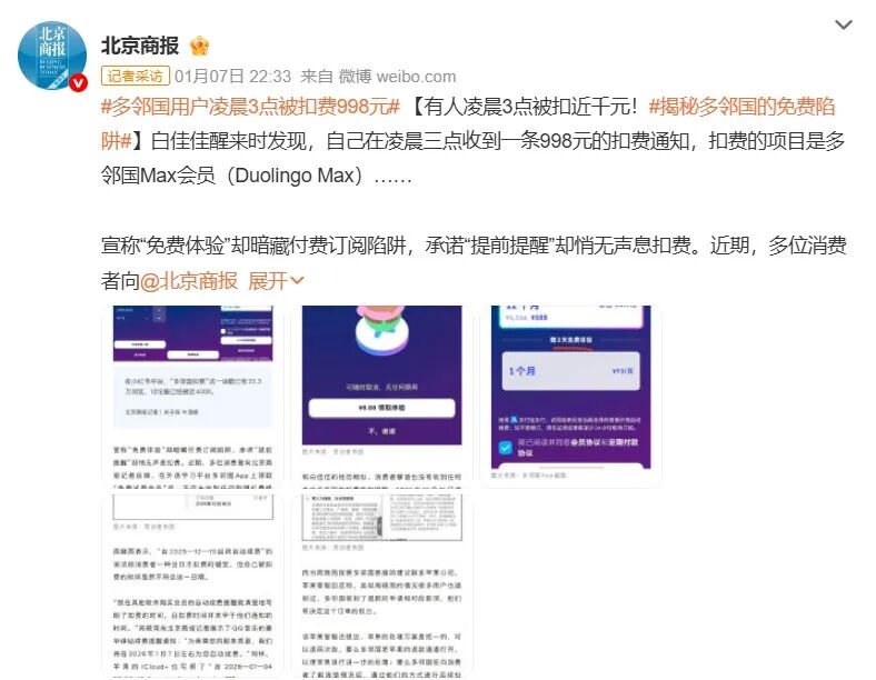 但这还没完——最近多邻国还因为另一件事上了热搜:很多用户半夜被偷偷扣款,最高扣了快 1000 块。说是免费试用,结果到期不提醒,凌晨直接扣钱,退款还踢皮球。