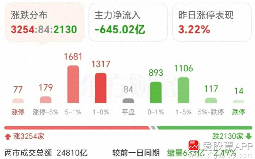 个股3254家上涨,中位数+0.44%,整体赚钱效应还凑合。两市成交2.48万亿,缩量了633亿!最近市场量能明显在减少,有节日的氛围了啊。