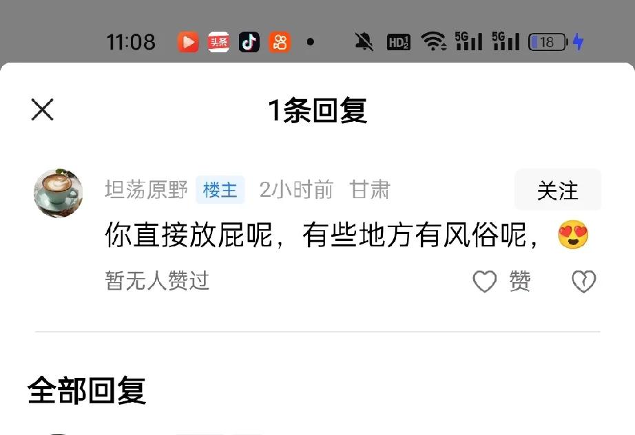 头条就有那么一批三观不正的人, 走到哪里发布评论到哪里, 别人说点啥, 他都得评价几句, 带着他扭曲的价值观, 到处留下他的足迹, 偶尔有个评论有人苟同, 他还洋洋得意的发个头条, 难道这样的人, 他不知道带着自己的IP吗? 有些口吐芬芳的, 还呲着大牙, 觉得自己特牛, 网络不是法外之地! 我前几天发个头条, 说父亲拦车问女儿要上车钱这事, 有个网友说我放P, 有的地方就有这种风俗, 但凡是懂点人事的家长, 闺女都上车了, 也不能再拦住车去闹啊!