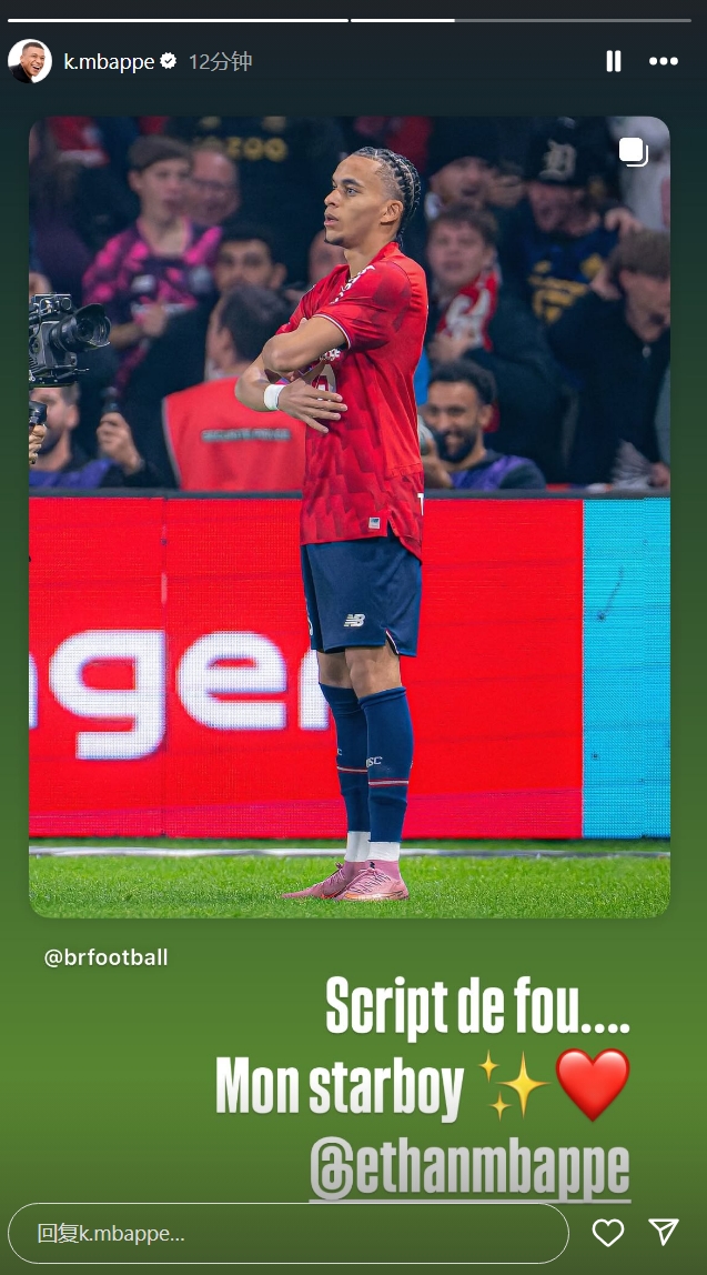 姆巴佩现场观看了这场比赛,见证弟弟绝平,他在社交媒体上晒出伊桑-姆巴佩的照片,配文:“疯狂的剧本,我的明星男孩。”