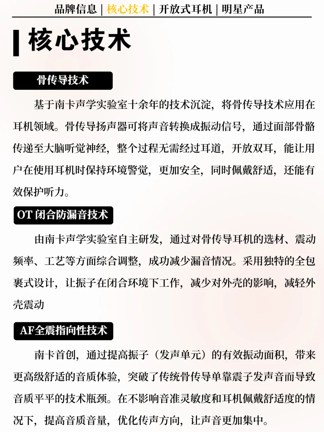 [点赞R] 核心技术:骨传导技术、OT 闭合防漏音技术、AF全震指向性技术。