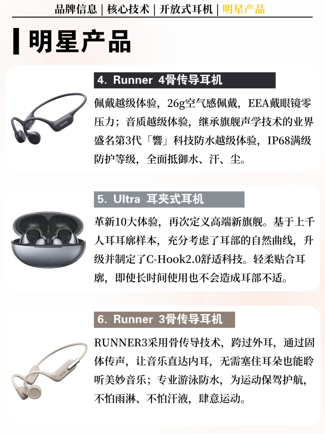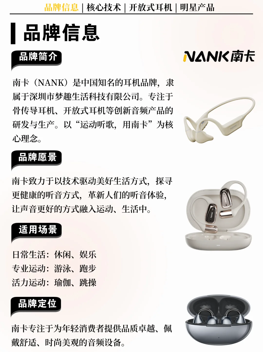 [向右R] 简介:南卡(NANK)是中国知名的耳机品牌,隶属于深圳市梦趣生活科技有限公司。专注于骨传导耳机、开放式耳机等创新音频产品的研发与生产。以“运动听歌,用南卡”为核心理念。